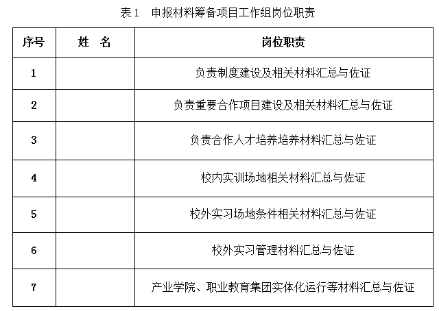 创本办现面向全校教职工公开征集创建职业本科大学申报“校企合作水平提升项目工作组”成员,具体岗位职责见表。