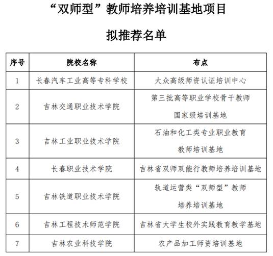 根据教育部办公厅《关于开展<高等职业教育创新发展行动计划(2015-2018年)>项目认定的通知》(教职成厅函〔2019〕8号)的要求,省教育厅组织专家组在省级认定的示范项目基础上,按照教育部分配的吉林省认定项目推荐限额,开展了遴选工作,经资格审查、会议评审,遴选出了骨干专业35个、校企共建的生产性实训基地17个、优质专科高等职业院校3所、“双师型”教师培养培训基地7个、技能大师工作室1个。