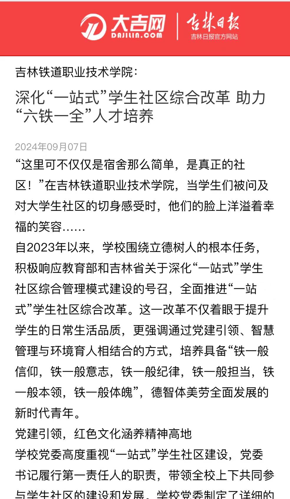 9月7日,【吉林日报】以“深化“一站式”学生社区综合改革助力“六铁一全”人才培养”为题对我校进行了报道。