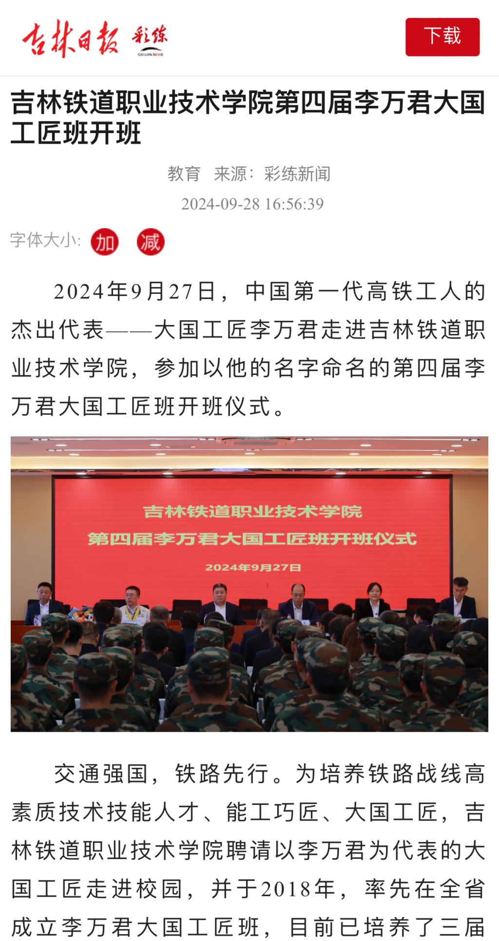 9月28日,【吉林日报】“彩练”以“吉林铁道职业技术学院第四届李万君大国工匠班开班”为题对我校进行了报道。