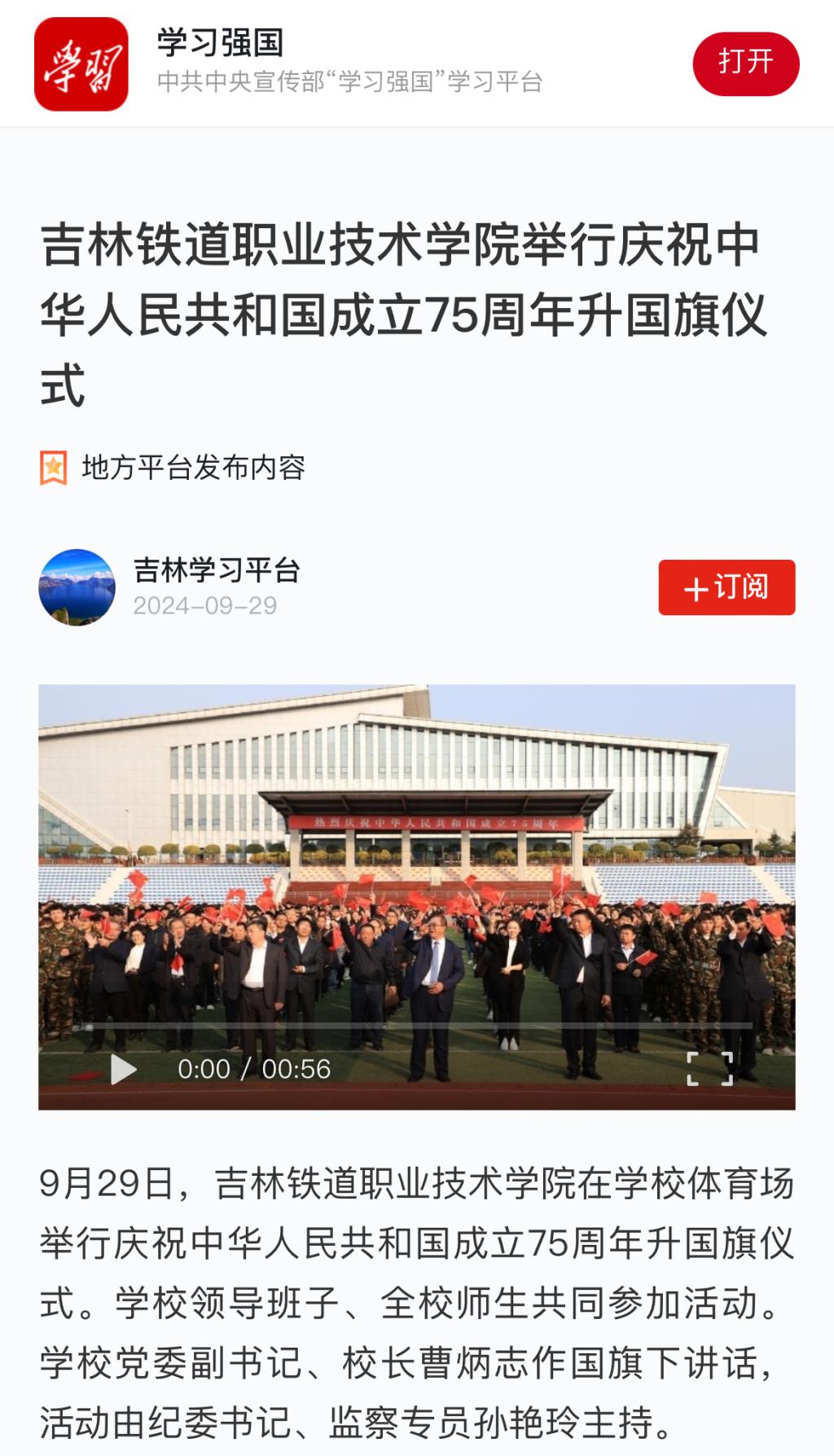 9月29日,【学习强国】以“吉林铁道职业技术学院举行庆祝中华人民共和国成立75周年升国旗仪式”为题对我校进行了报道。