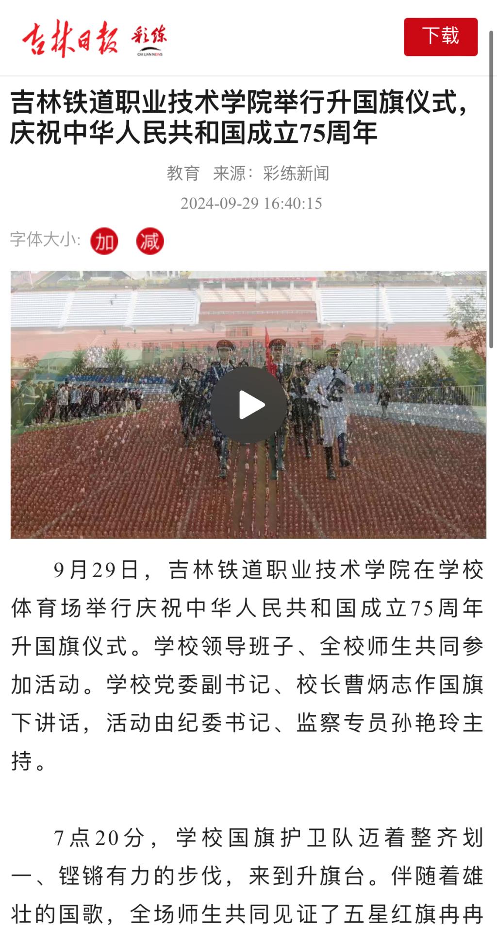 9月29日,【吉林日报】“彩练”以“吉林铁道职业技术学院举行升国旗仪式,庆祝中华人民共和国成立75周年”为题对我校进行了报道。