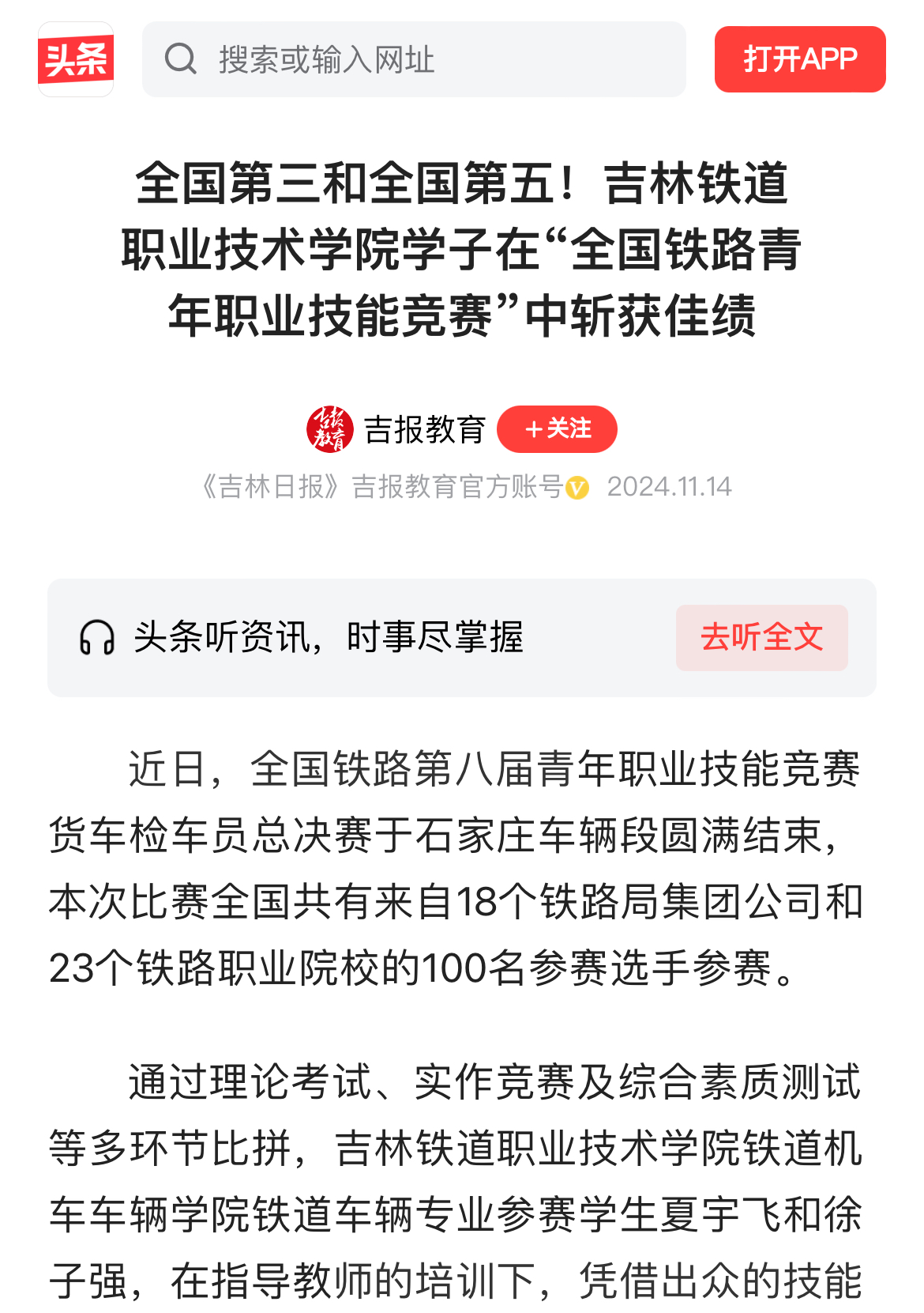 11月14日,【今日头条】“吉报教育”以“全国第三和全国第五!吉林铁道职业技术学院学子在“全国铁路青年职业技能竞赛”中斩获佳绩”为题对我校进行了报道。