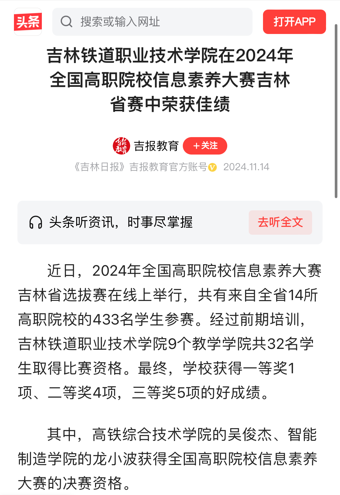 11月14日,【今日头条】“吉报教育”以“吉林铁道职业技术学院在2024年全国高职院校信息素养大赛吉林省赛中荣获佳绩”为题对我校进行了报道。