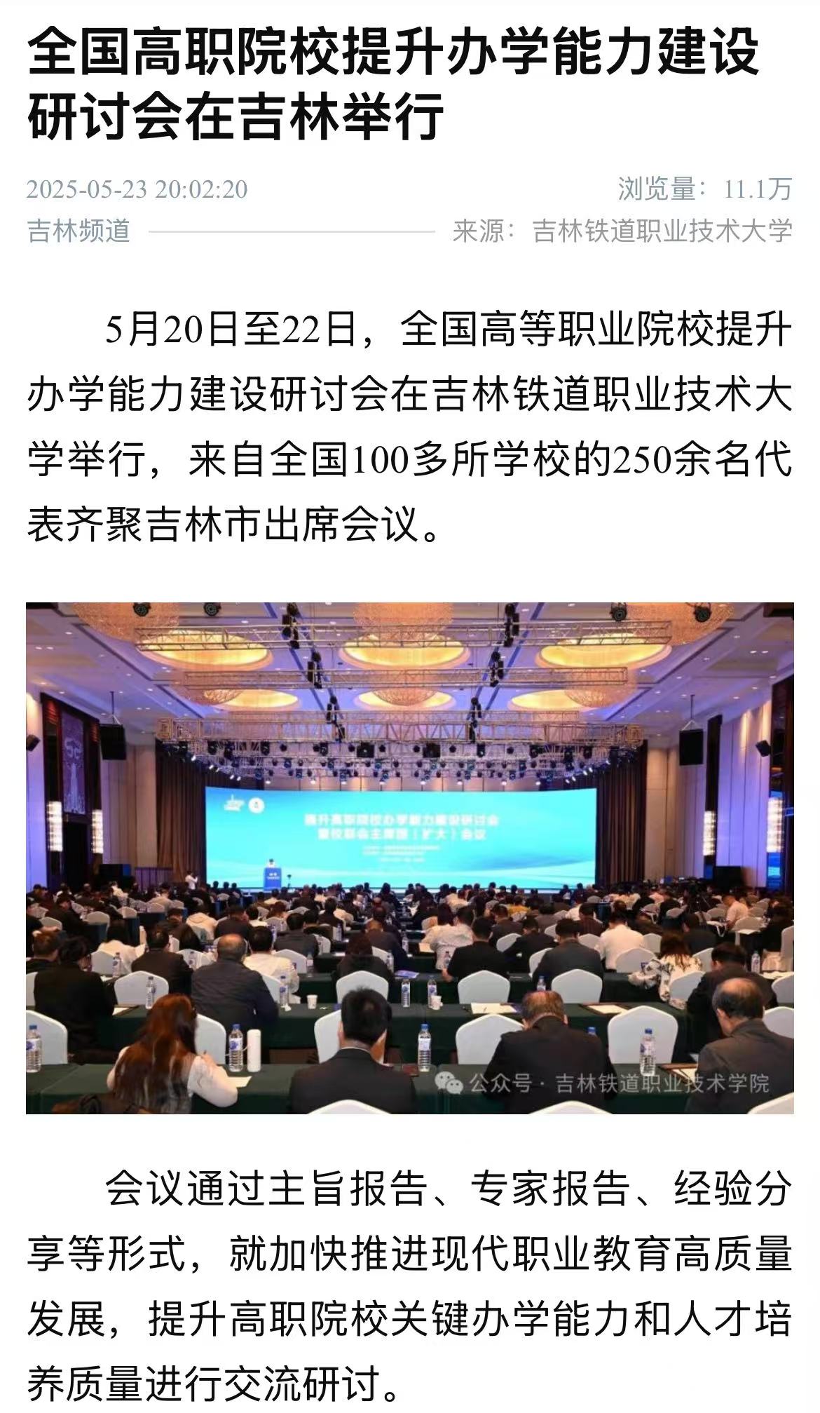 5月23日【吉报频道】以“全国高职院校提升办学能力建设研讨会在吉林举行”为题对我校进行了报道。