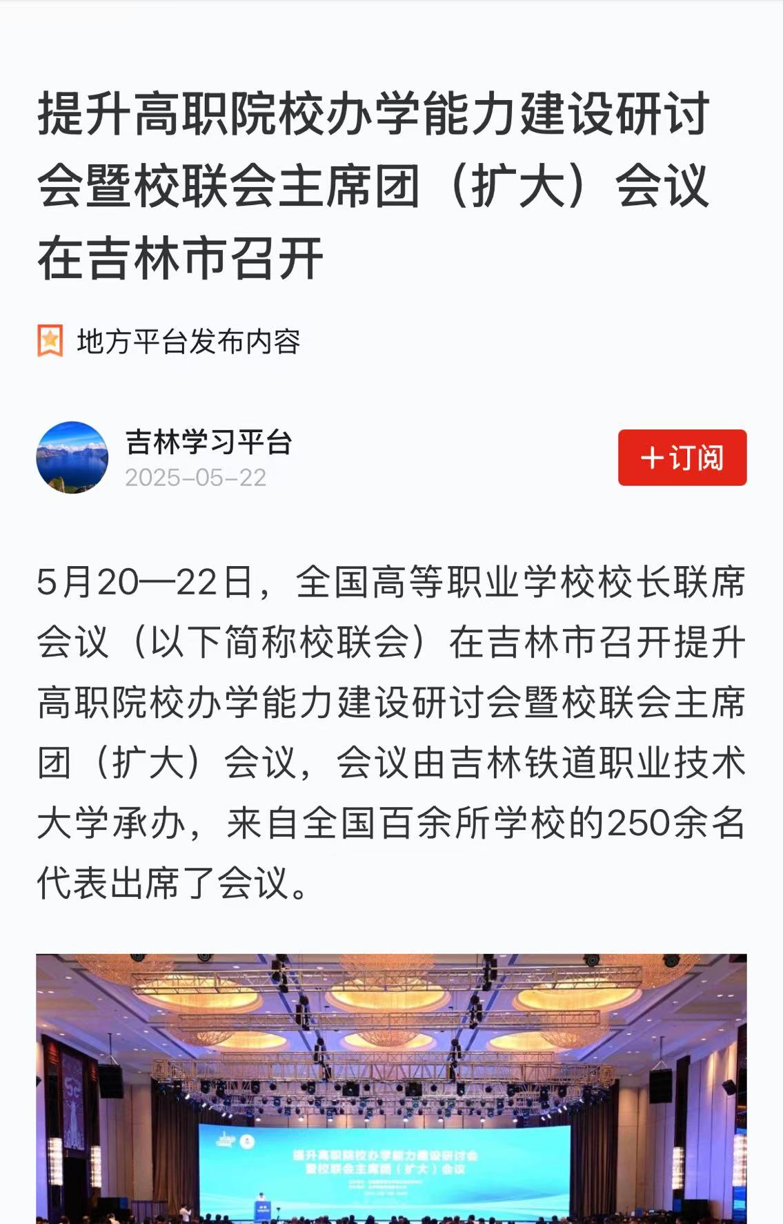 5月22日【学习强国】以“提升高职院校办学能力建设研讨会暨校联会主席团(扩大)会议在吉林市召开”为题对我校进行了报道。