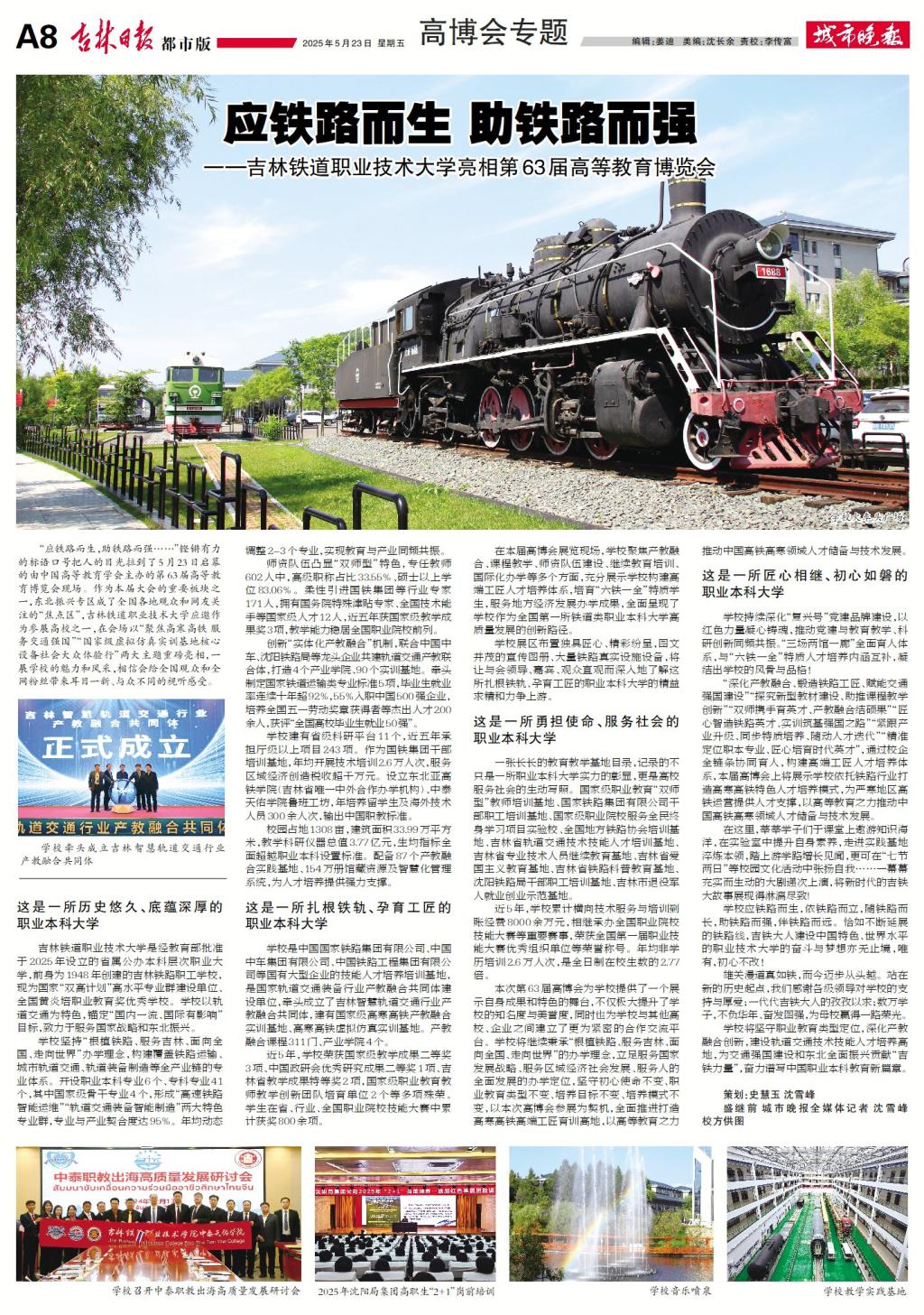 5月23日【吉林日报】以“应铁路而生 助铁路而强 ——吉林铁道职业技术大学亮相第63届高等教育博览会”为题对我校进行了报道。