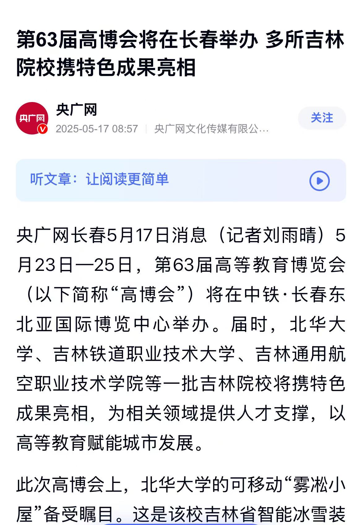 5月17日【央广网】以“第63届高博会将在长春举办 多所吉林院校携特色成果亮相”为题对我校进行了报道。