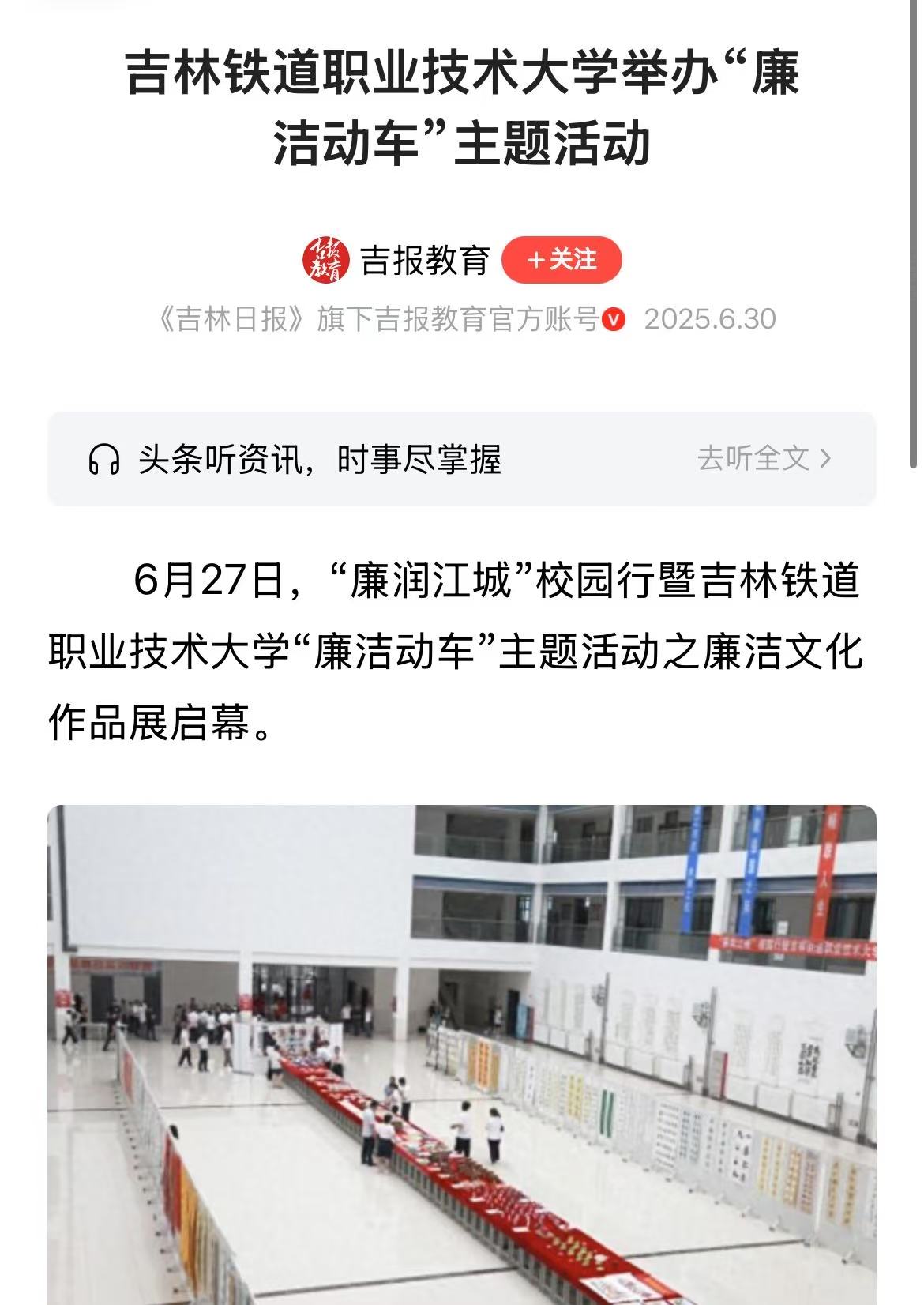 6月30日,【吉报教育】以“吉林铁道职业技术大学举办“廉洁动车”主题活动”为题对我校进行了报道。
