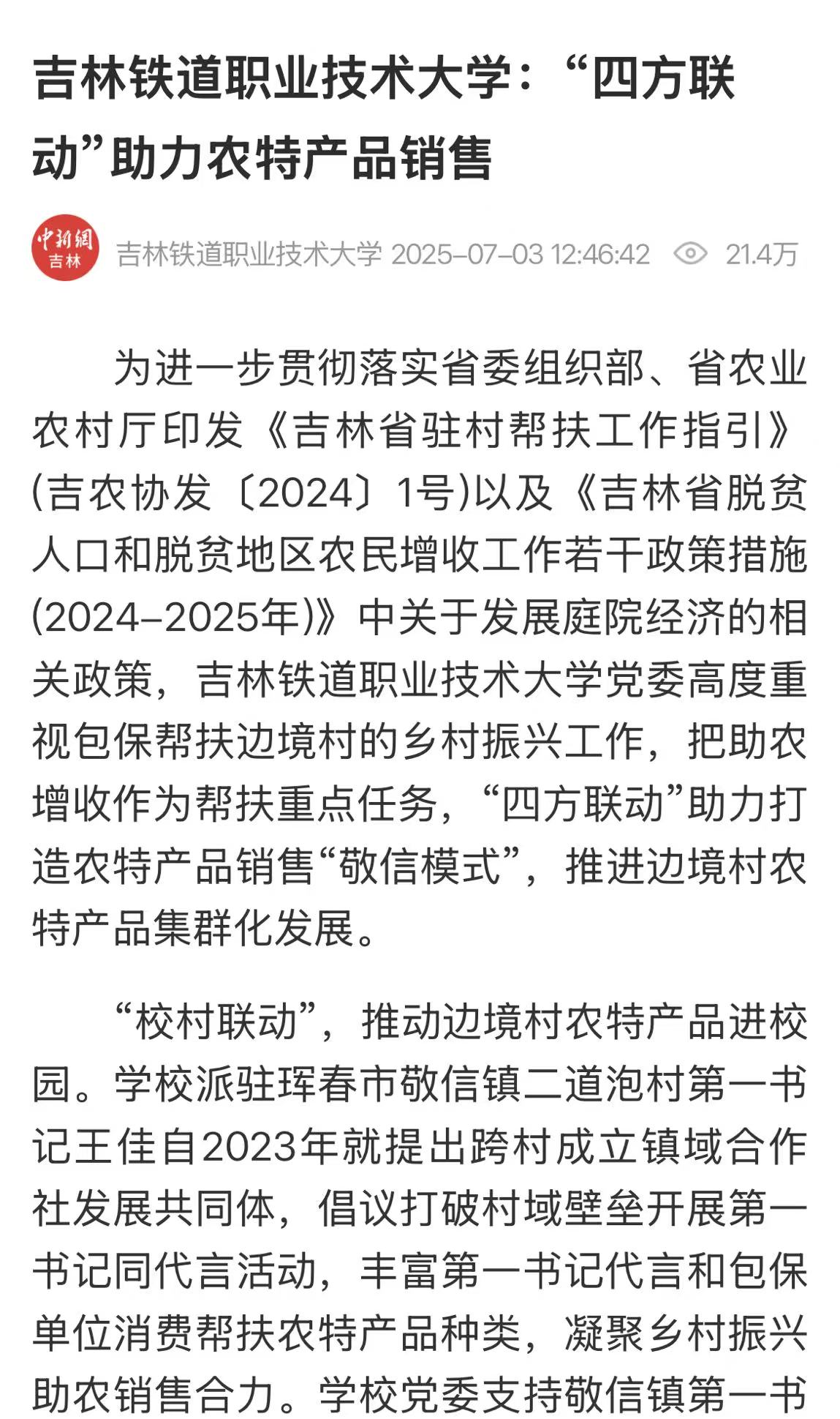 7月3日,【中国新闻网】以“吉林铁道职业技术大学:“四方联动”助力农特产品销售”为题对我校进行了报道。