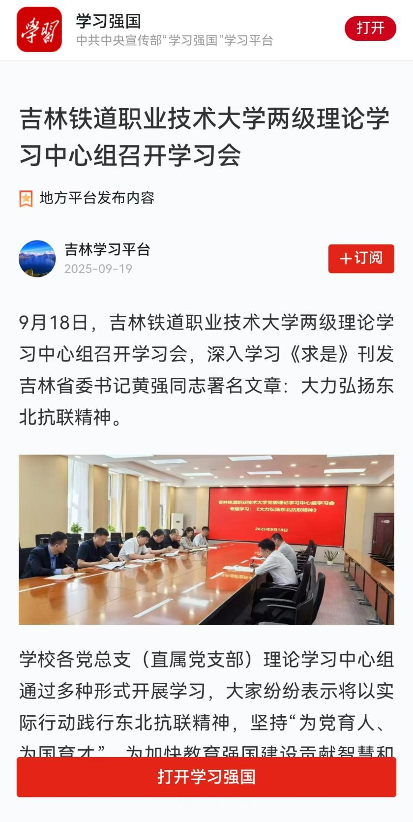 9月19日,【学习强国】以“吉林铁道职业技术大学两级理论学习中心组召开学习会”为题对我校进行了报道。