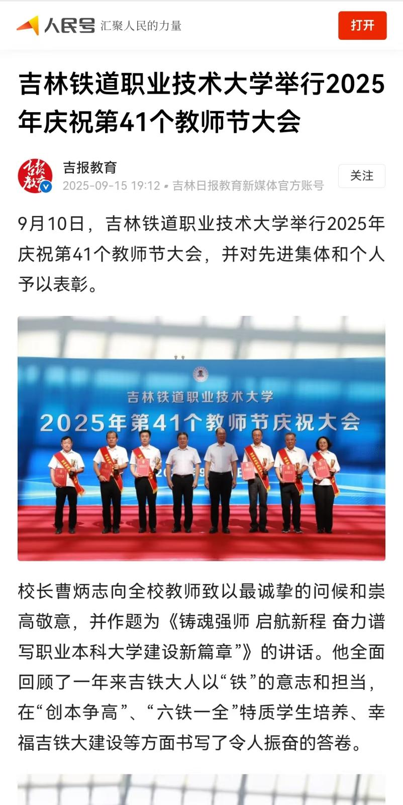 9月15日,【人民日报】以“吉林铁道职业技术大学举行2025年庆祝第41个教师节大会”为题对我校进行了报道。