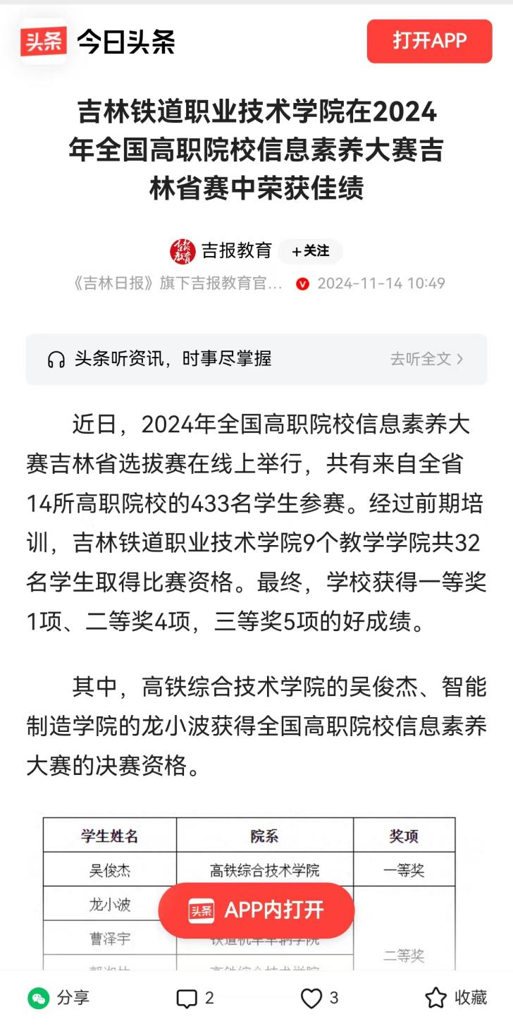11月14日,【今日头条】以“吉林铁道职业技术学院在2024年全国高职院校信息素养大赛吉林省赛中荣获佳绩”为题对我校进行了报道。