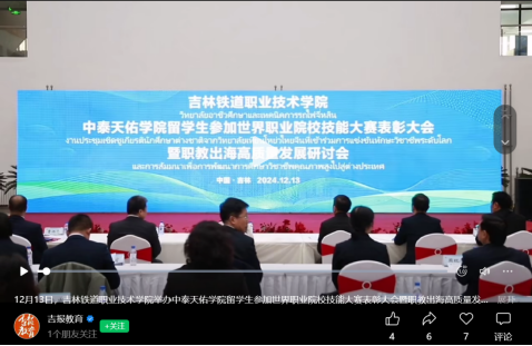 12月15日,【吉报教育】以“林铁道职业技术学院举办中泰天佑学院留学生参加世界职业院校技能大赛表彰大会暨职教出海高质量发展研讨会”为题对我校进行了报道。