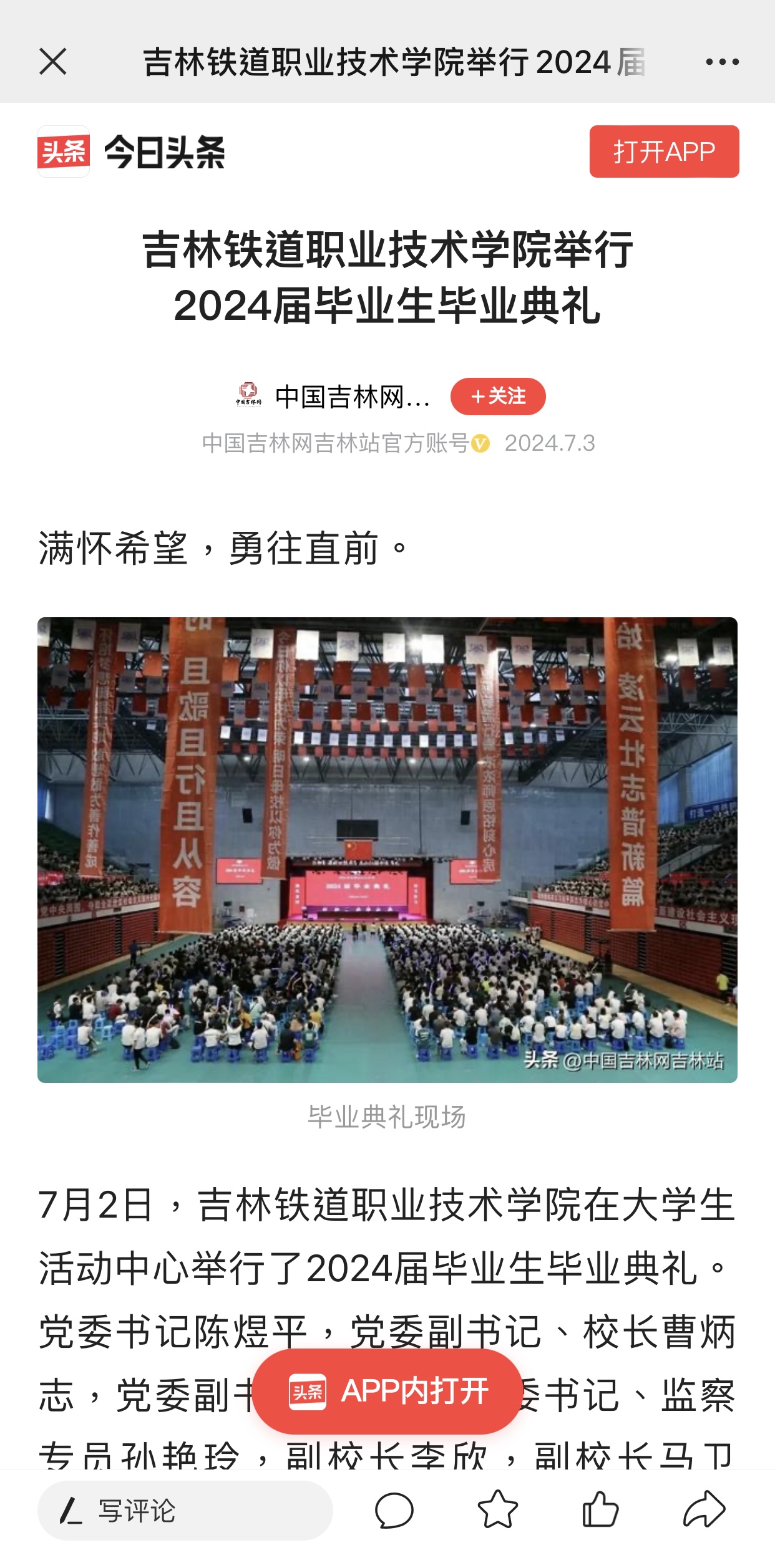 7月3日,【今日头条】以“吉林铁道职业技术学院举行2024届毕业生毕业典礼”为题对我校进行了报道。