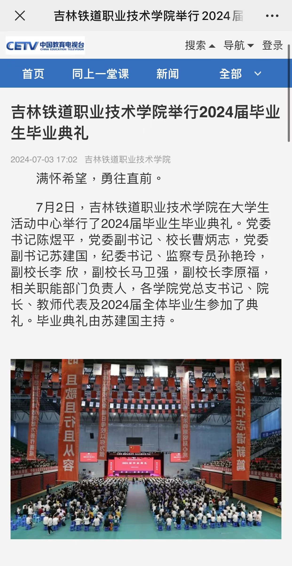 7月3日,【中国教育电视台】以“吉林铁道职业技术学院举行2024届毕业生毕业典礼”为题对我校进行了报道。