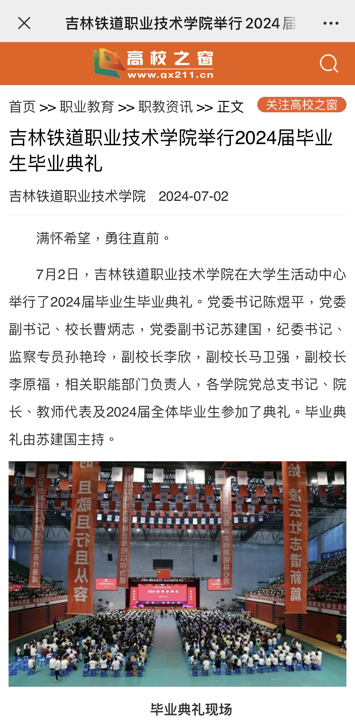 7月2日,【高校之窗】以“吉林铁道职业技术学院举行2024届毕业生毕业典礼”为题对我校进行了报道。