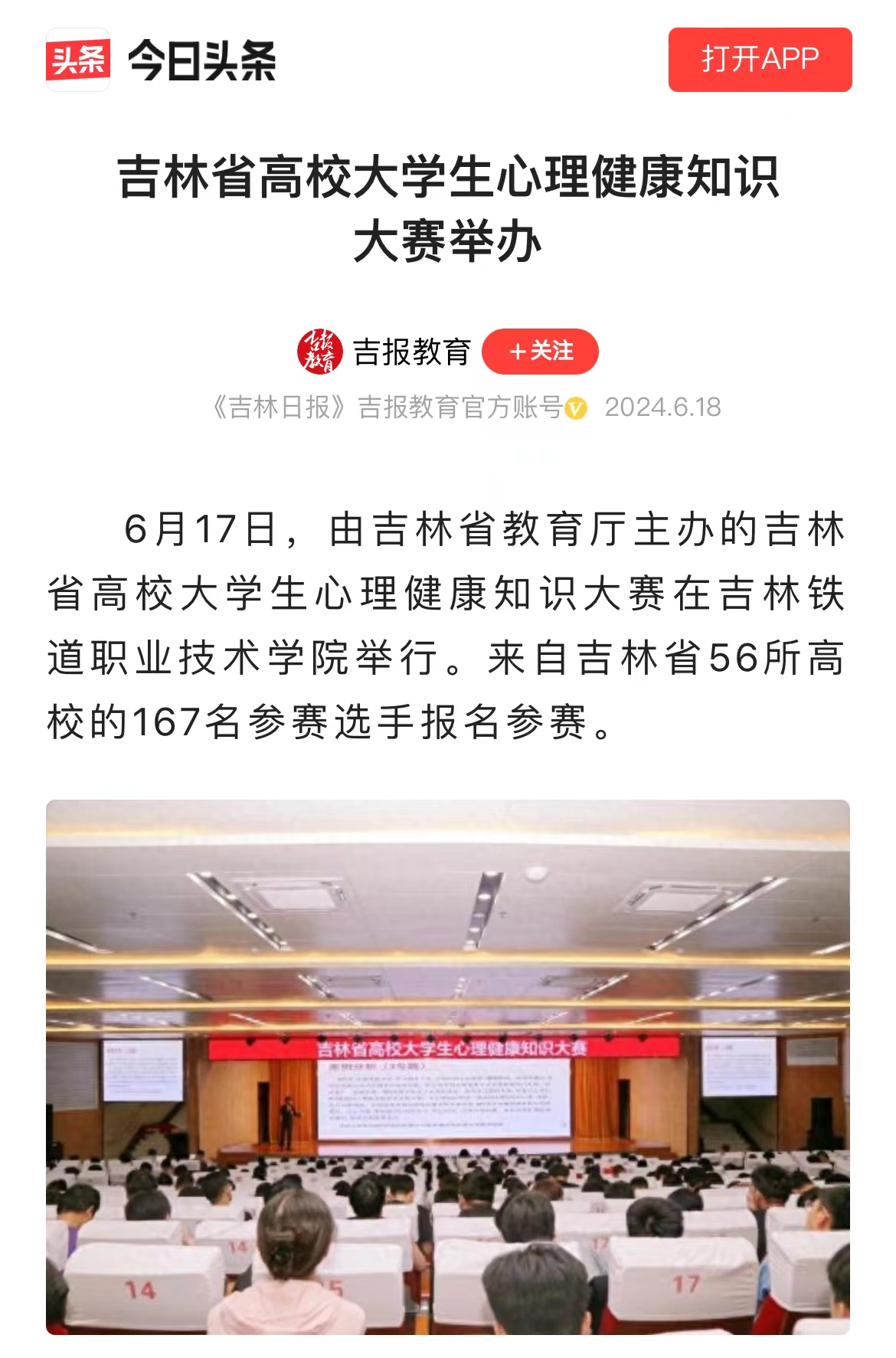 6月18日,【今日头条】“吉报教育”以“吉林省高校大学生心理健康知识大赛举办”为题对我校进行了报道。