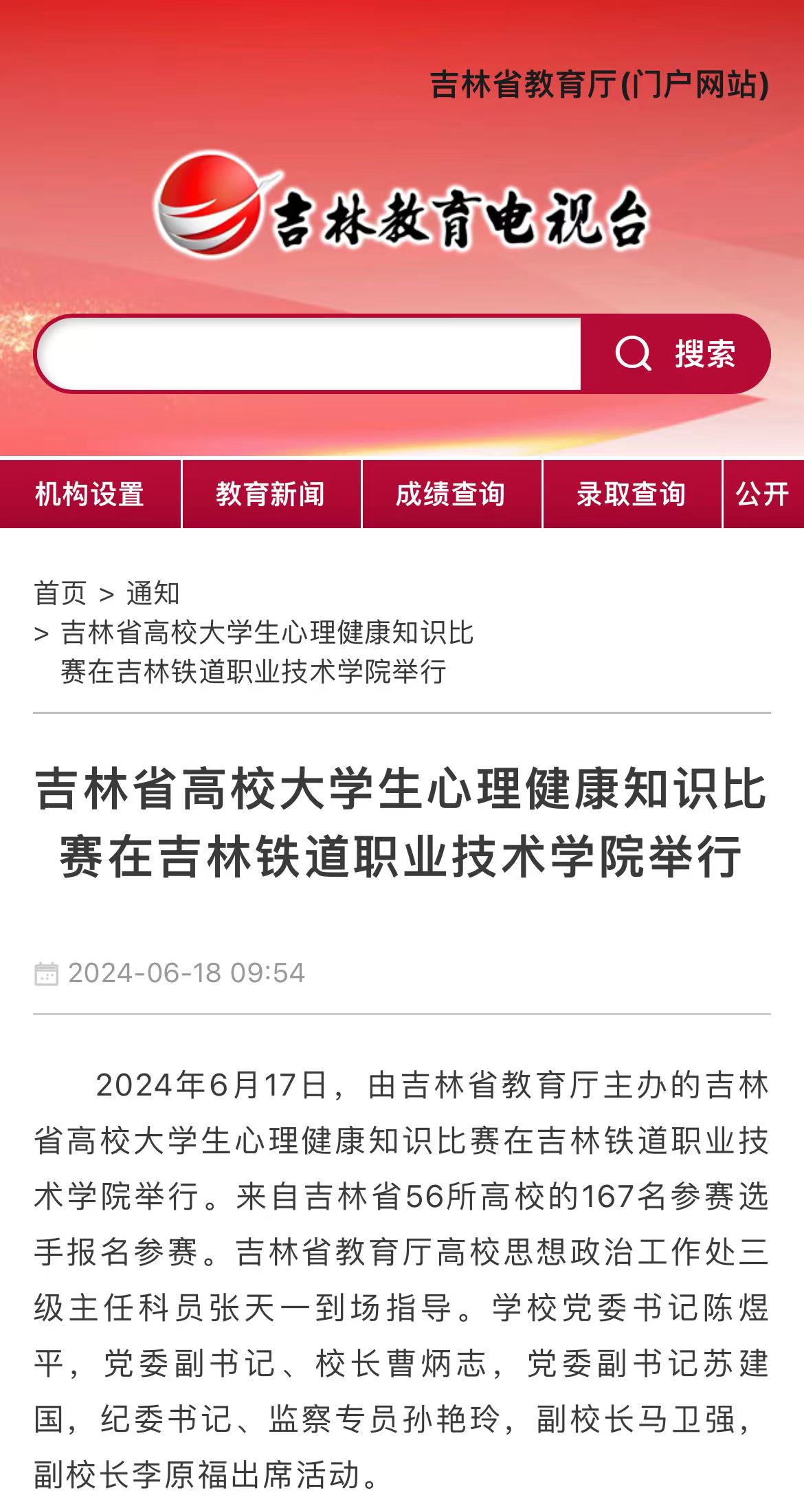 6月18日,【吉林教育电视台】以“吉林省高校大学生心理健康知识比赛在吉林铁道职业技术学院举行”为题对我校进行了报道。