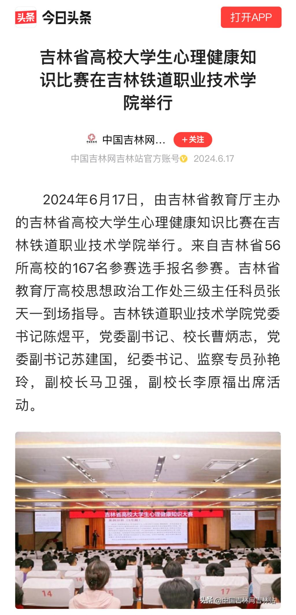 6月17日,【今日头条】“中国吉林网吉林站”以“吉林省高校大学生心理健康知识比赛在吉林铁道职业技术学院举行”为题对我校进行了报道。