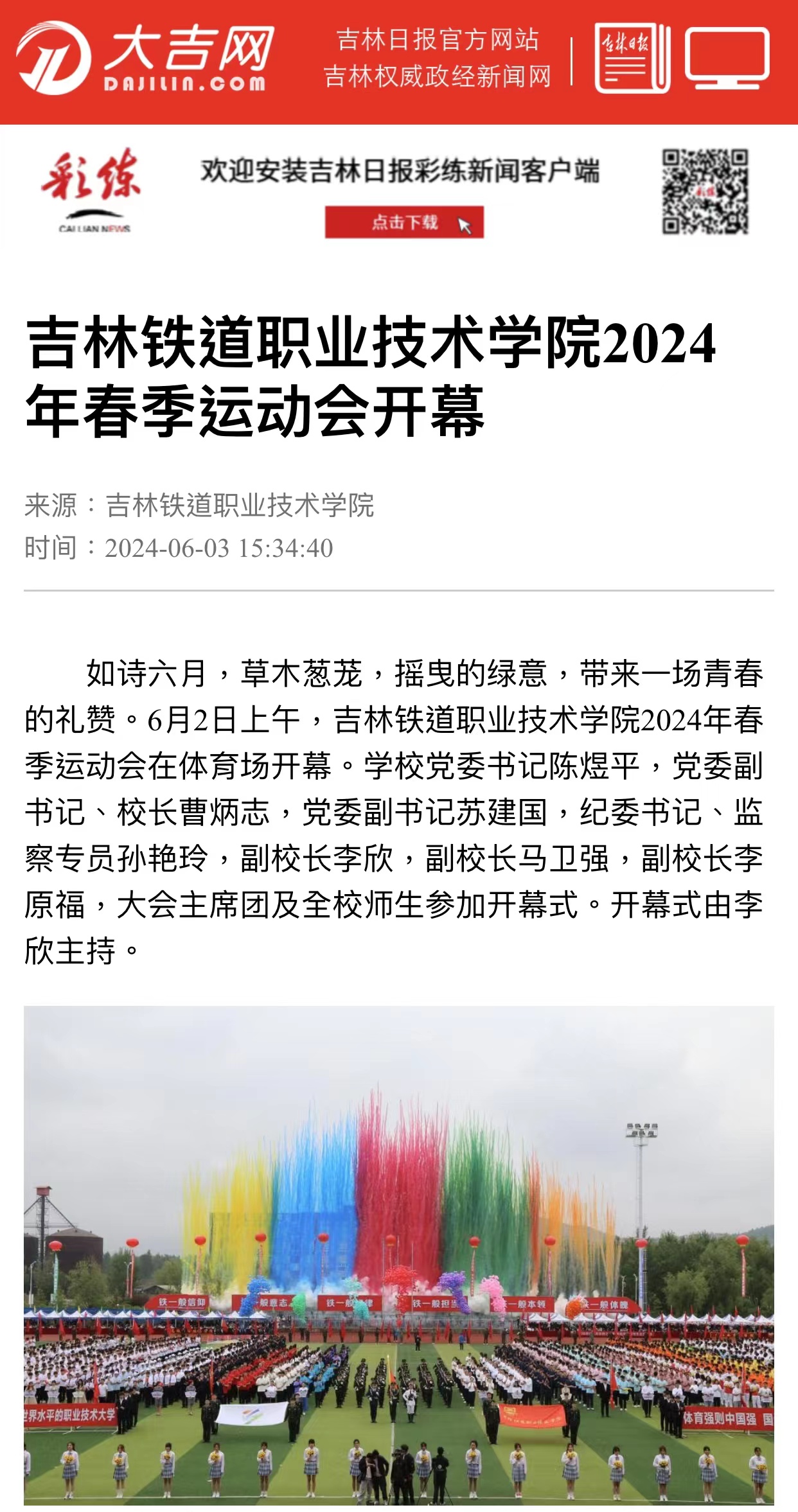 6月3日,【大吉网】“彩练”以“吉林铁道职业技术学院2024年春季运动会开幕”为题对我校进行了报道。