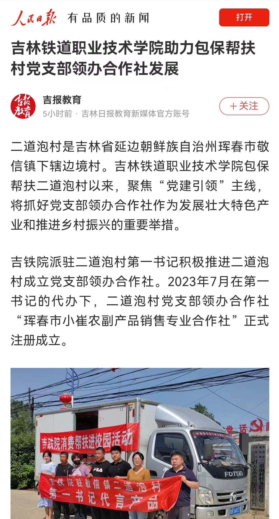 4月23日,【人民日报】“吉报教育”以“吉林铁道职业技术学院助力包保帮扶村党支部领办合作社发展”为题对我校进行了报道。
