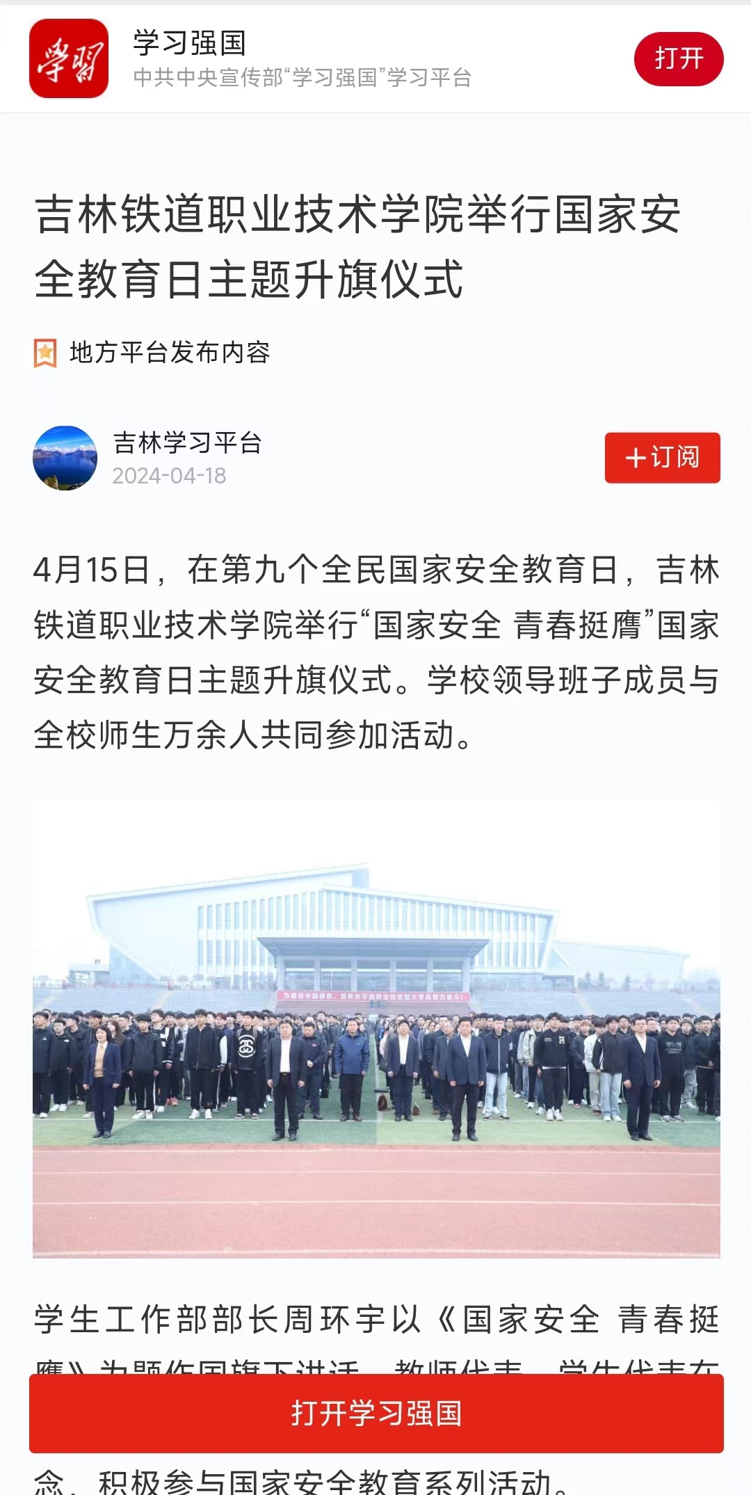 4月18日,【学习强国】“吉林学习平台”以“吉林铁道职业技术学院举行国家安全教育日主题升旗仪式”为题对我校进行了报道。