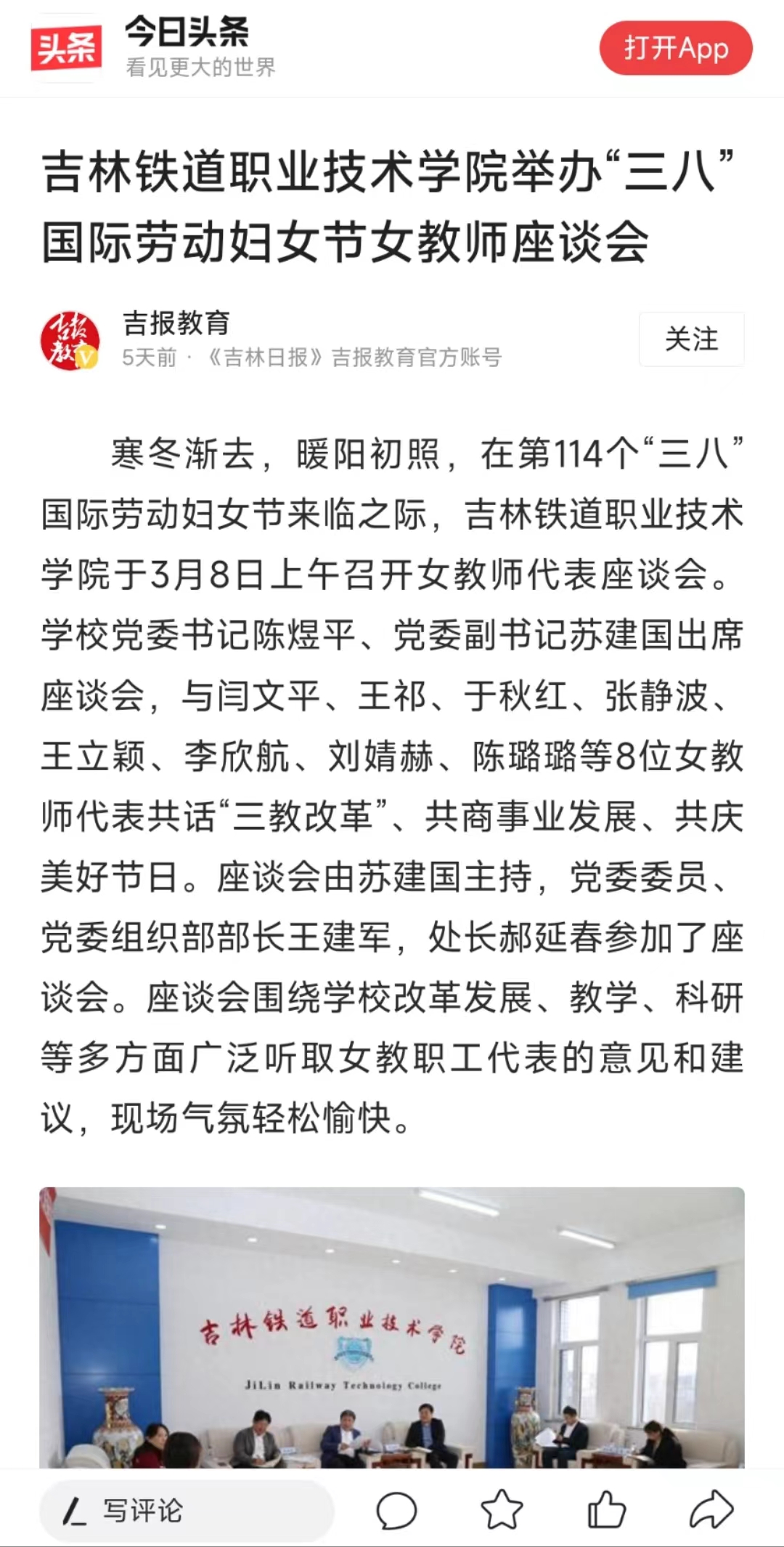 3月9日,【今日头条】“吉报教育”以“吉林铁道职业技术学院举办“三八”国际劳动妇女节女教师座谈会”为题对我校进行了报道。