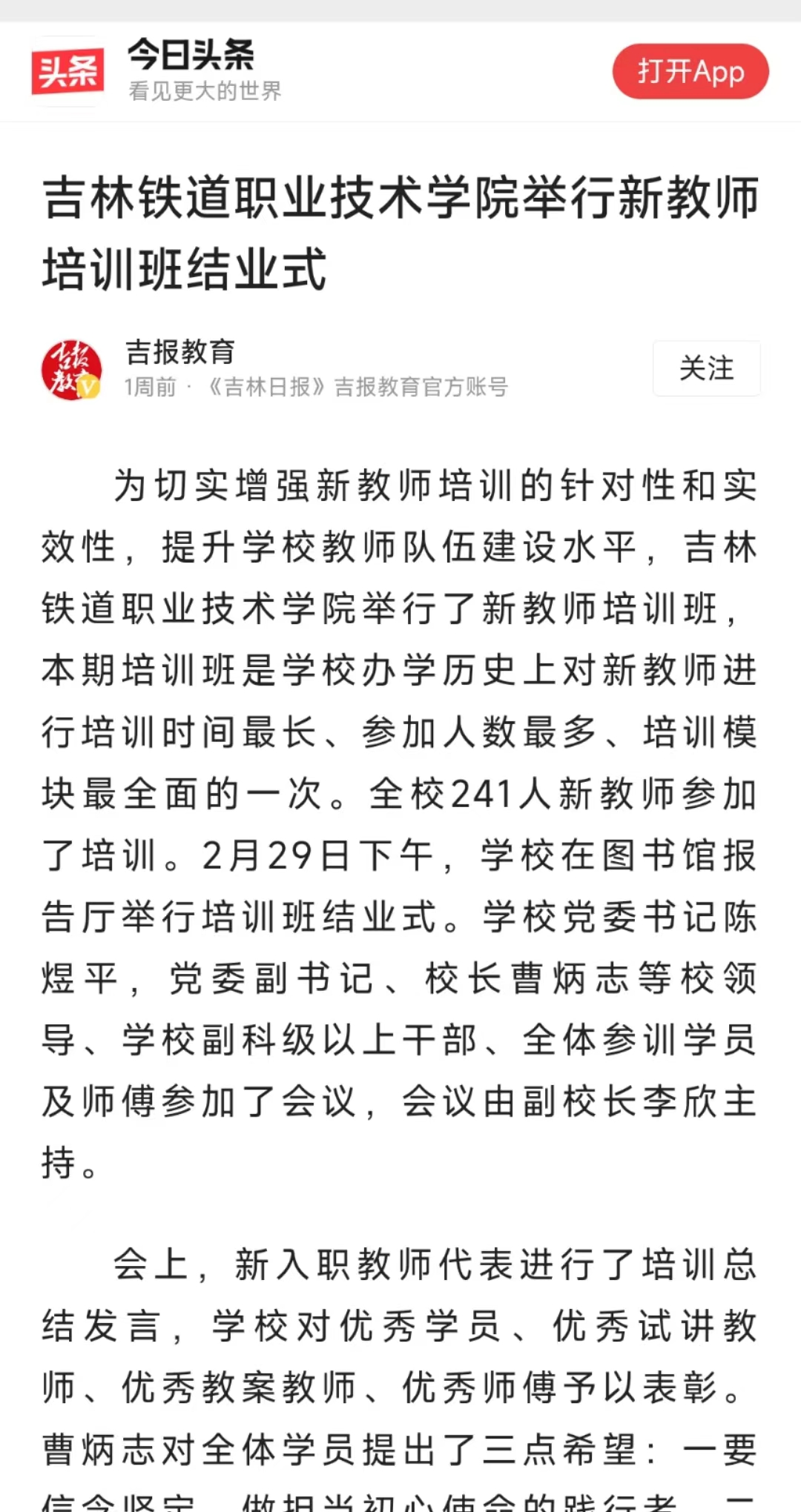 3月7日,【今日头条】“吉报教育”以“吉林铁道职业技术学院举行新教师培训班结业式”为题对我校进行了报道。