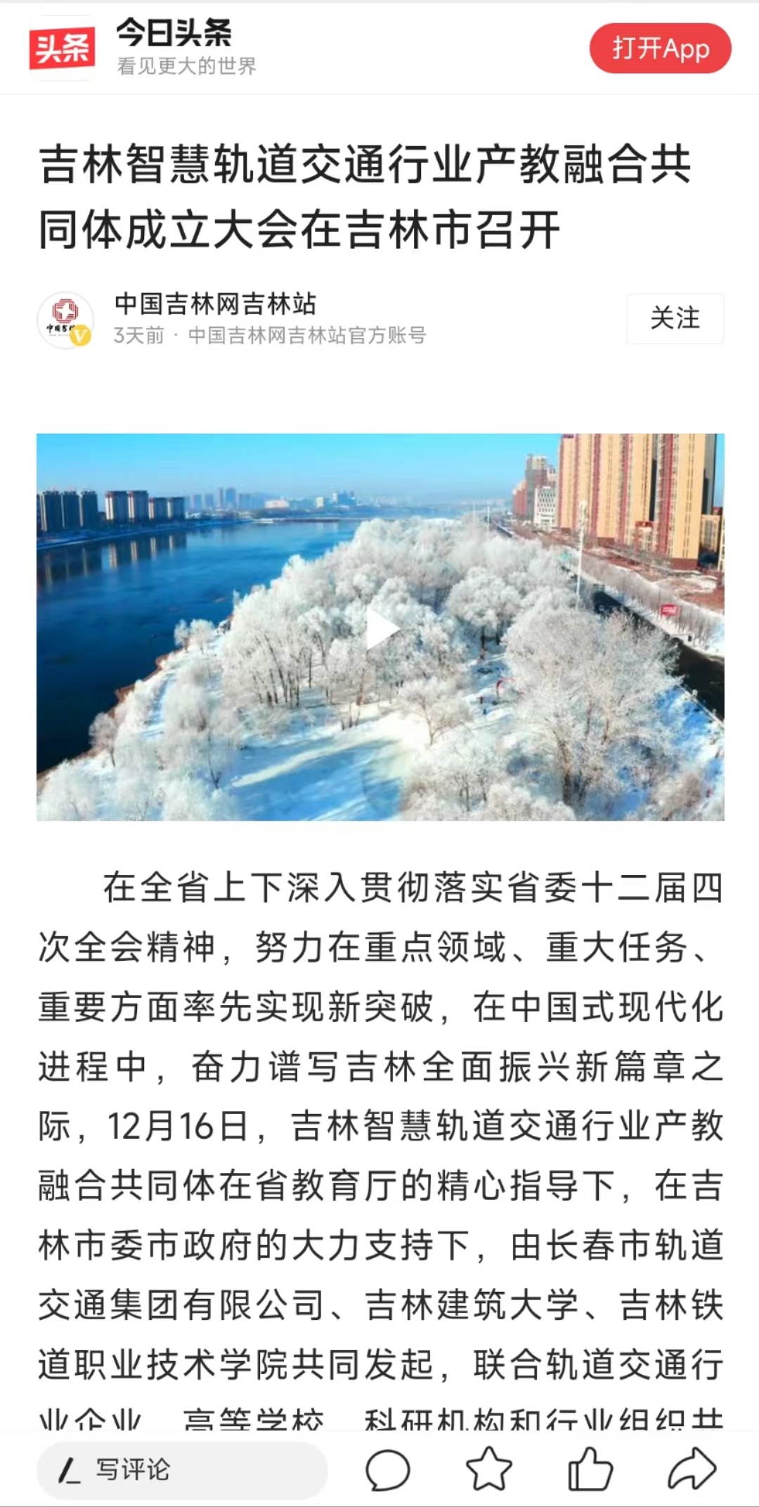 12月17日,【今日头条】“中国吉林网吉林站”以“吉林智慧轨道交通行业产教融合共同体成立大会在吉林市召开”为题对我校进行了报道。