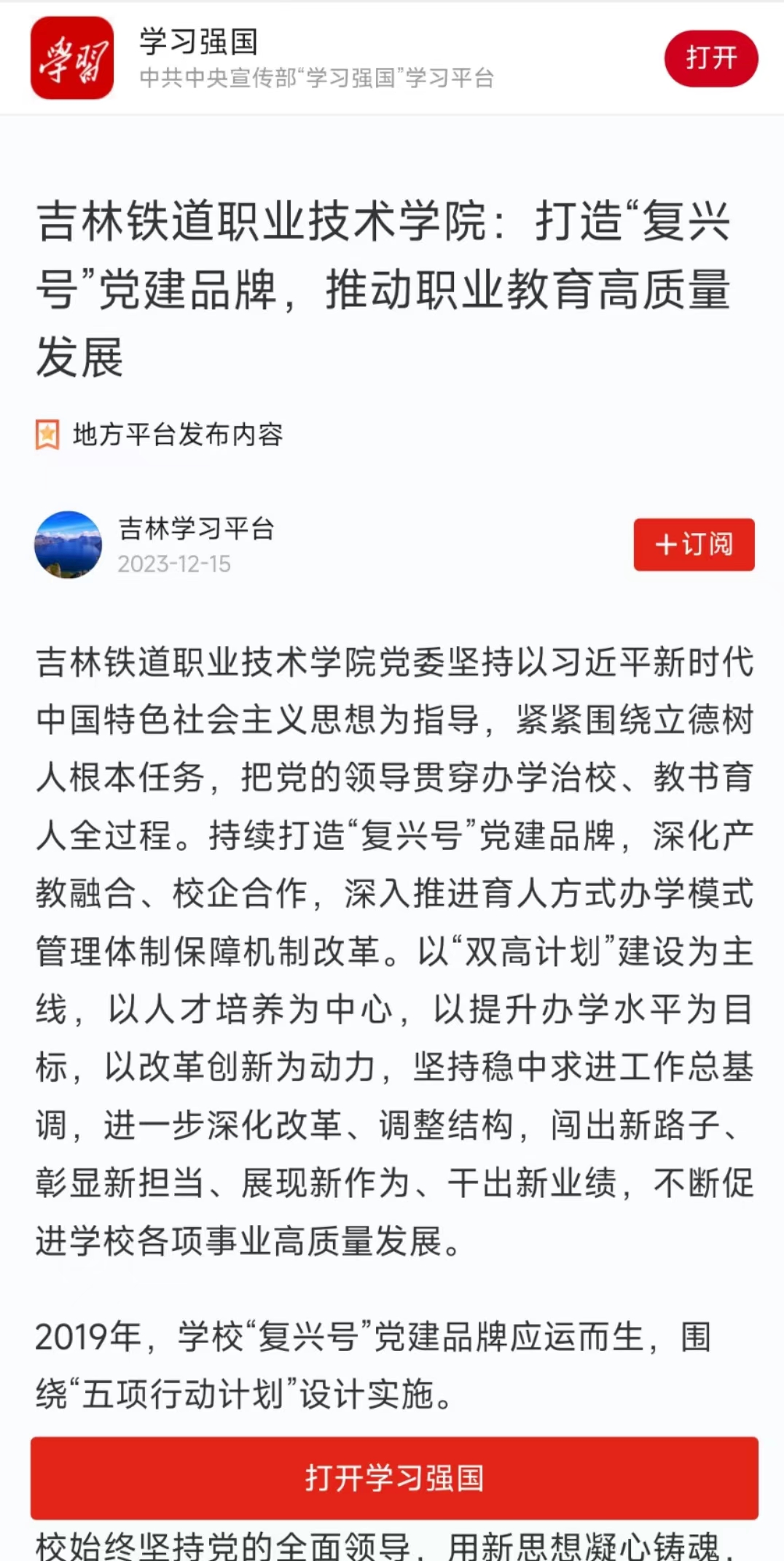 12月15日,【学习强国】以“吉林铁道职业技术学院:打造“复兴号”党建品牌,推动职业教育高质量发展”为题对我校进行了报道。