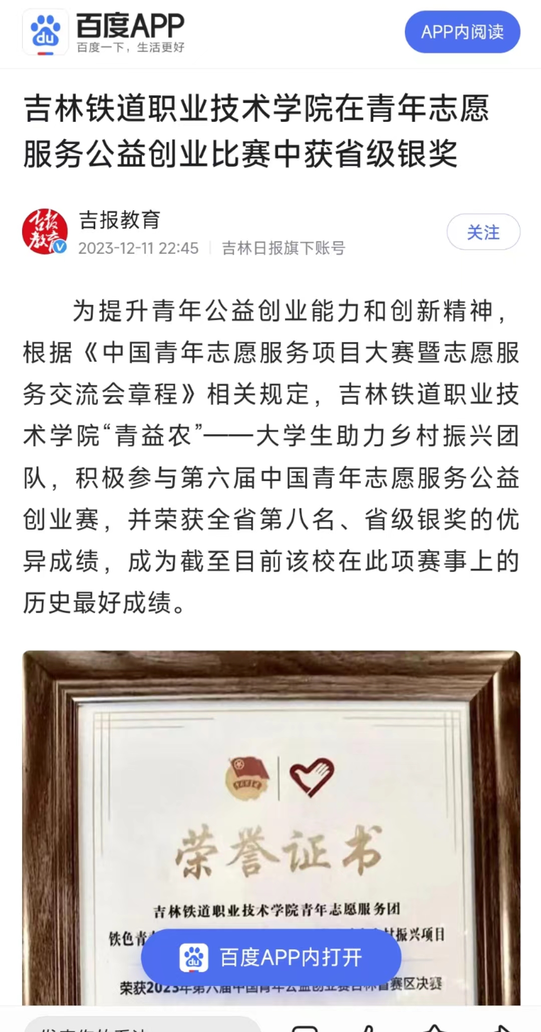 12月11日,【吉报教育】以“吉林铁道职业技术学院在青年志愿服务公益创业比赛中获省级银奖”为题对我校进行了报道。