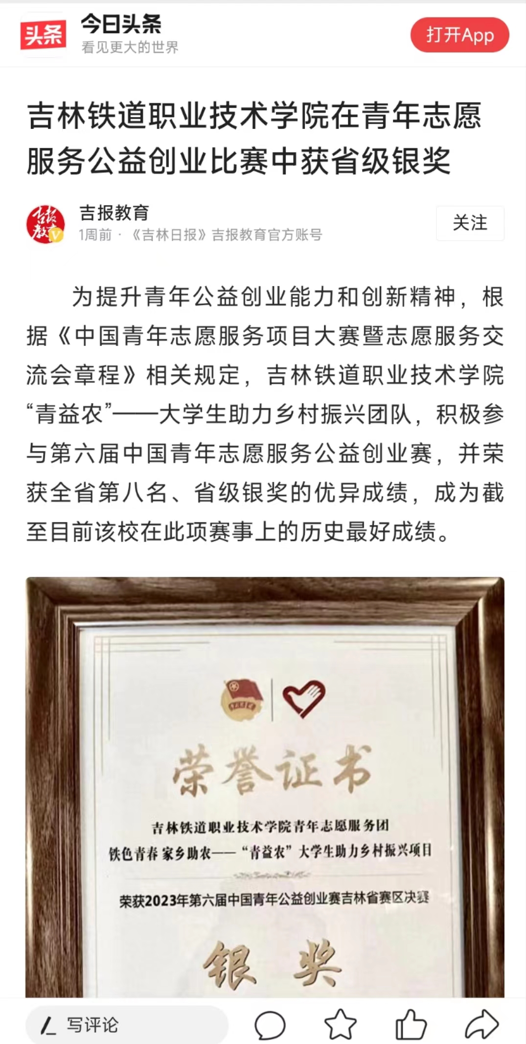 12月13日,【今日头条】“吉报教育”以“吉林铁道职业技术学院在青年志愿服务公益创业比赛中获省级银奖”为题对我校进行了报道。