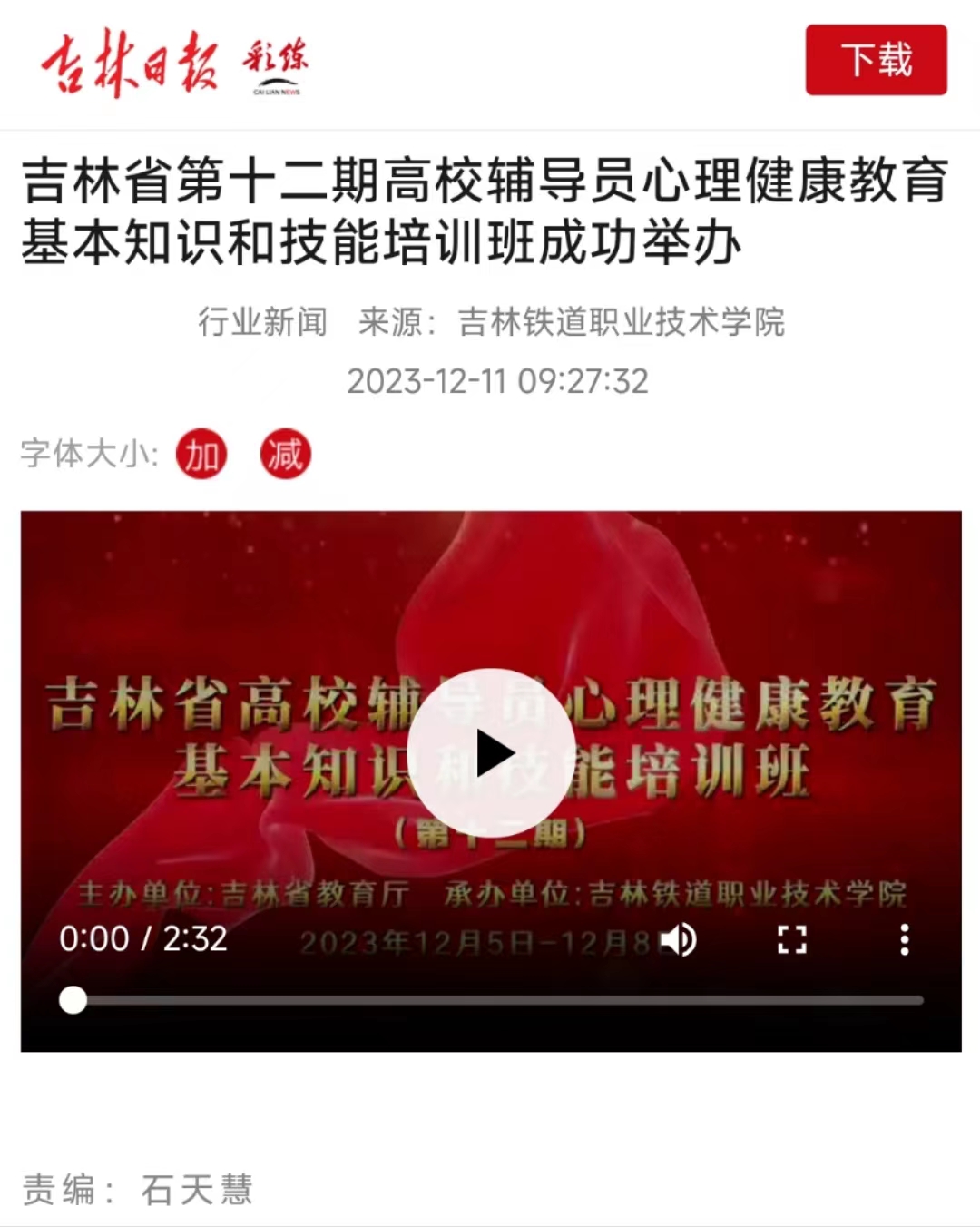 12月11日,【吉林日报】以“吉林省第十二期高校辅导员心理健康教育基本知识和技能培训班成功举办”为题对我校进行了报道。