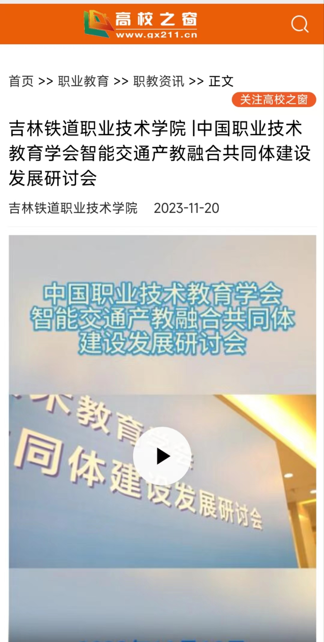 11月20日,【高校之窗】以“吉林铁道职业技术学院 |中国职业技术教育学会智能交通产教融合共同体建设发展研讨会”为题对我校进行了报道。