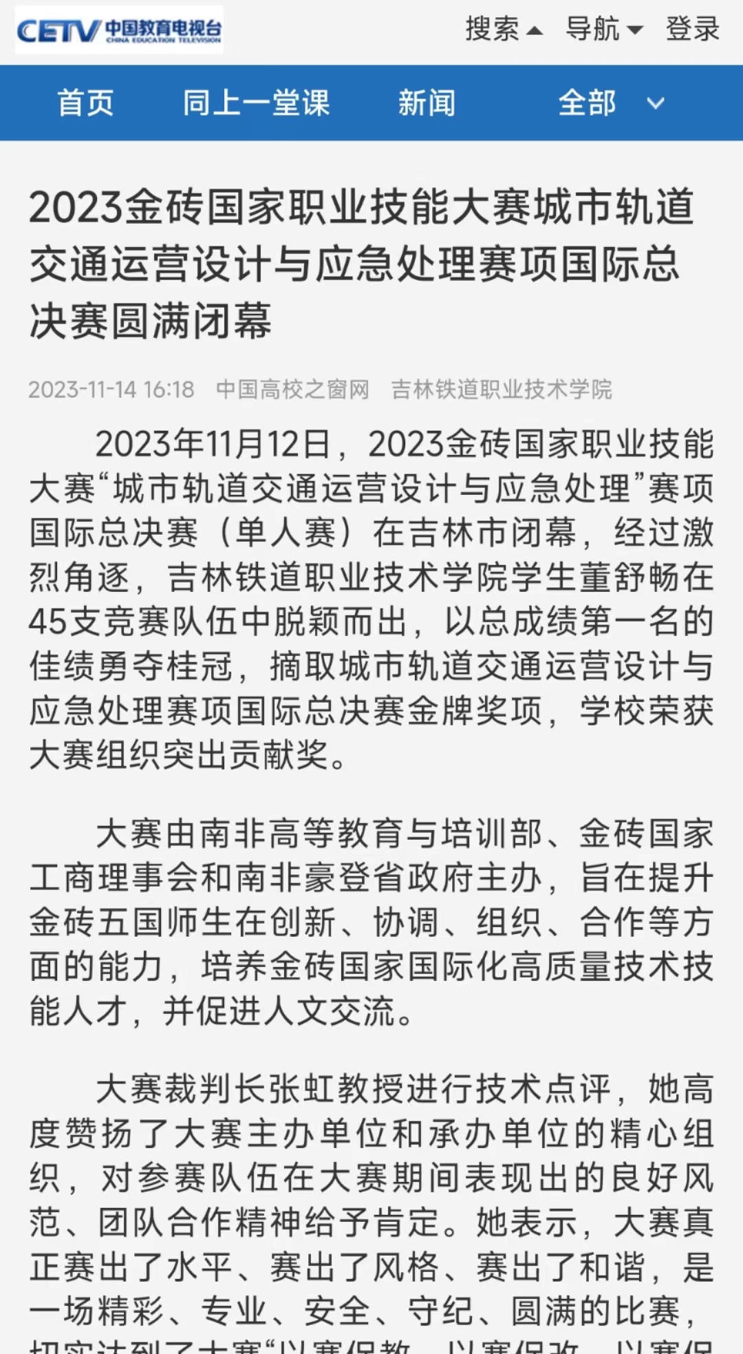 11月14日,【中国教育电视台】以“2023金砖国家职业技能大赛城市轨道交通运营设计与应急处理赛项国际总决赛在吉林铁道职业技术学院隆重开幕”为题对我校进行了报道。