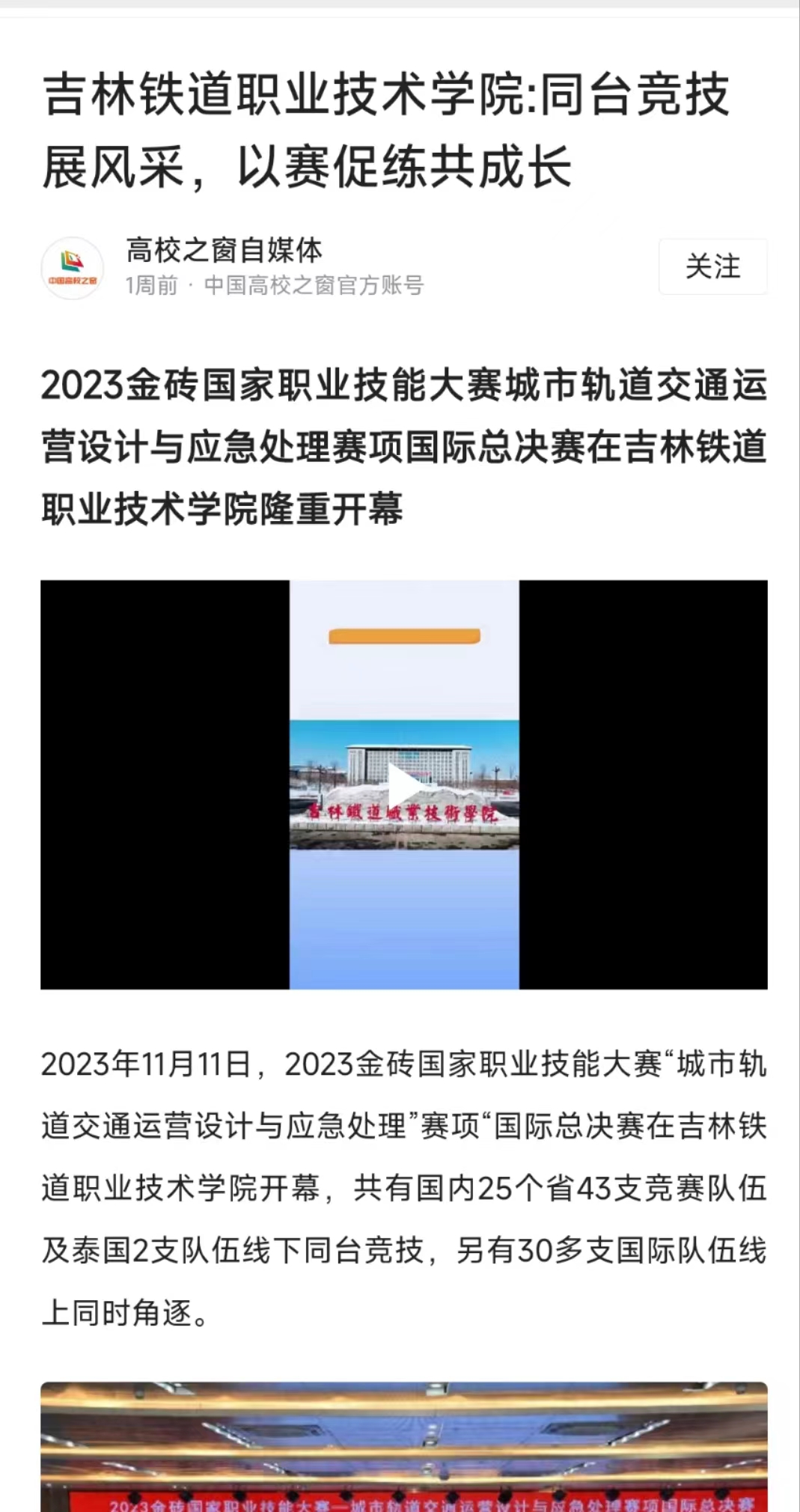 11月20日,【高校之窗】以“吉林铁道职业技术学院:同台竞技展风采,以赛促练共成长”为题对我校进行了报道。