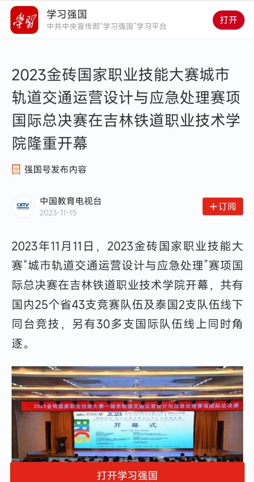 11月15日,【中国教育电视台】以“2023金砖国家职业技能大赛城市轨道交通运营设计与应急处理赛项国际总决赛在吉林铁道职业技术学院隆重开幕”为题对我校进行了报道。