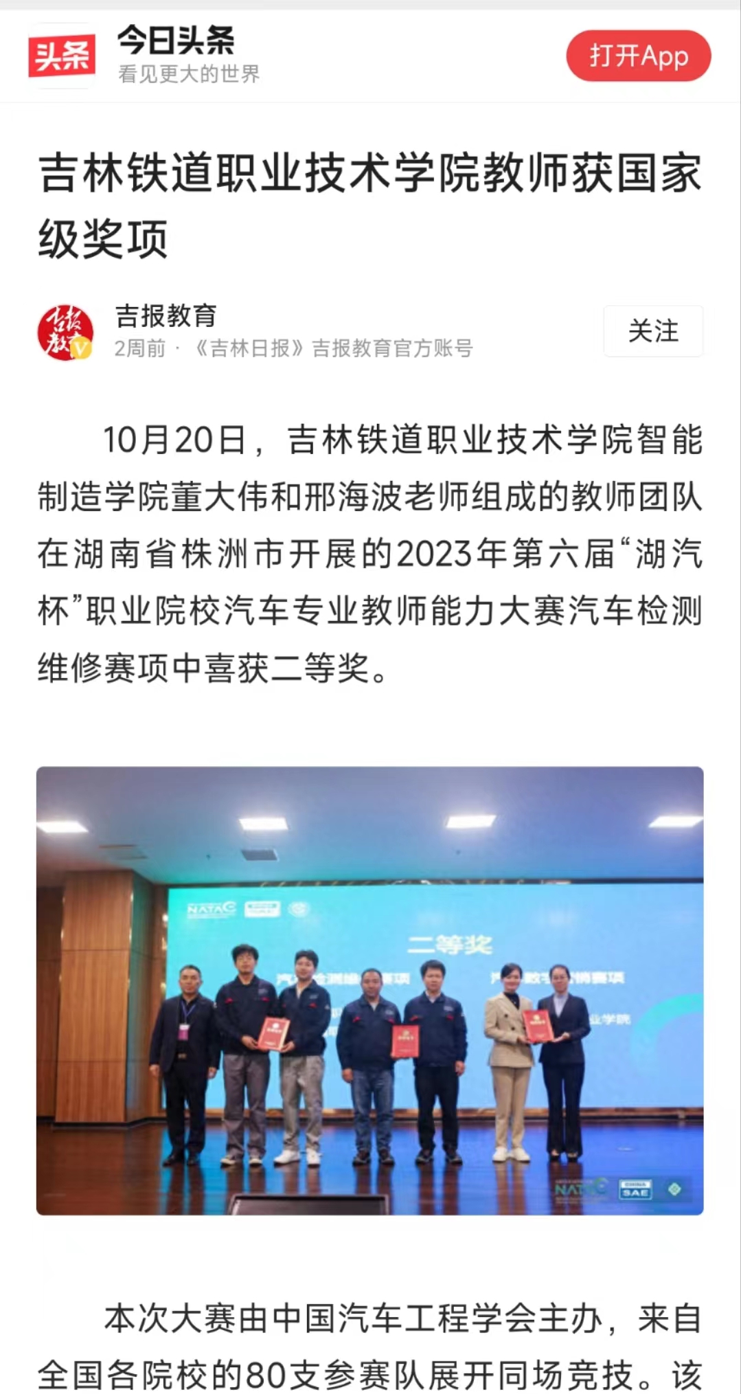 10月24日,【吉报教育】以“吉林铁道职业技术学院教师获国家级奖项”为题对我校进行了报道。