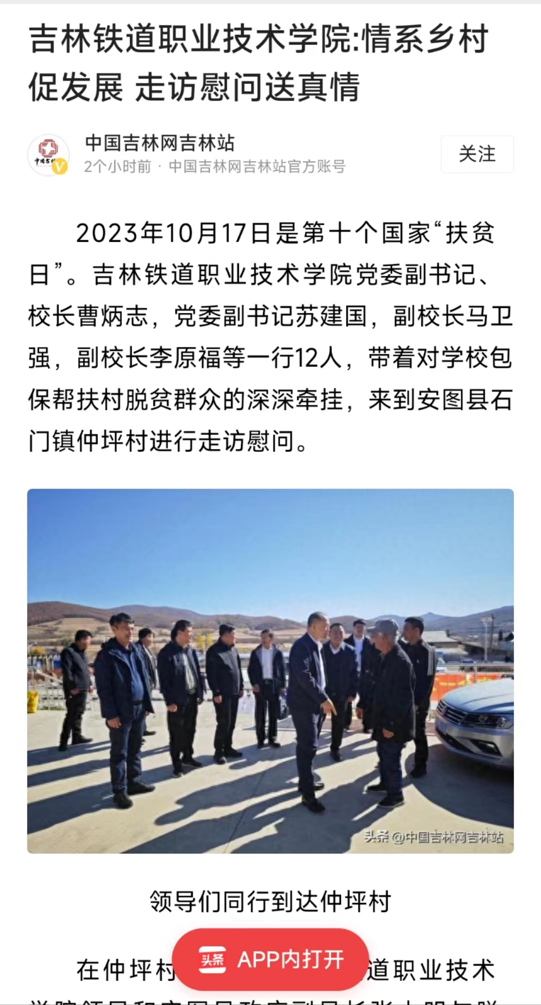 10月18日,【中国吉林网吉林站】以“吉林铁道职业技术学院:情系乡村促发展 走访慰问送真情”为题对我校进行了报道。