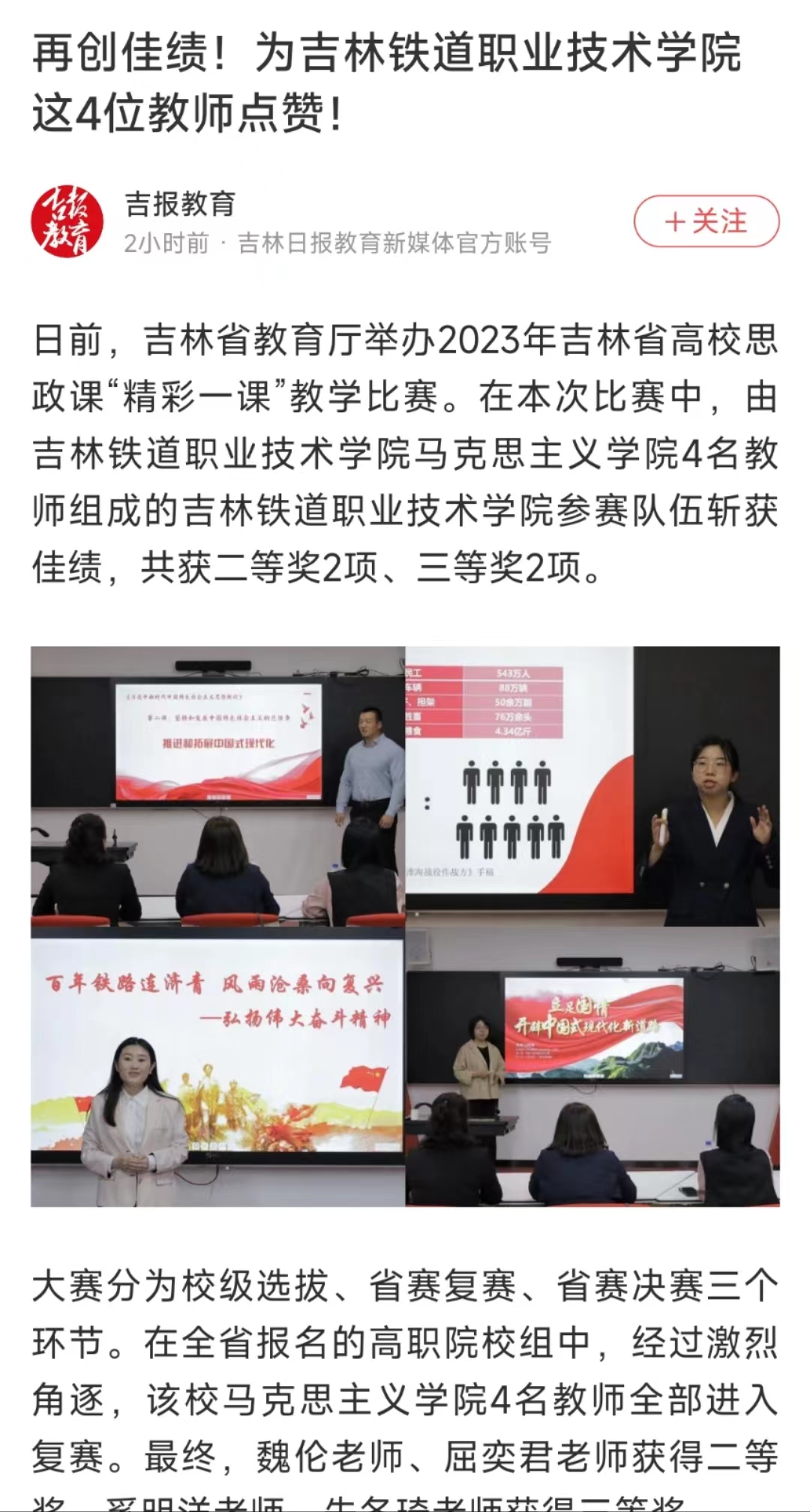 10月18日,【吉报教育】以“再创佳绩!为吉林铁道职业技术学院这4位教师点赞”为题对我校进行了报道。