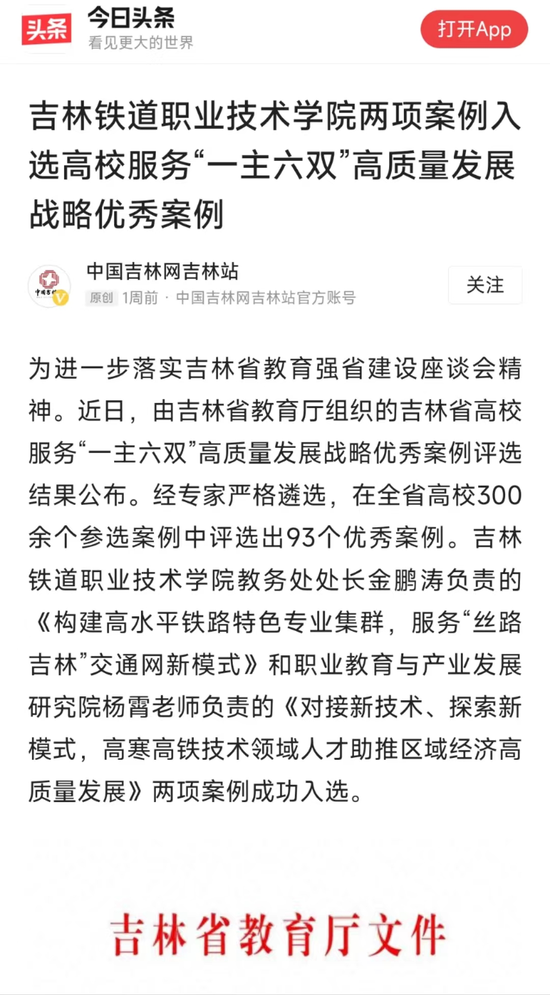 10月11日,【中国吉林网吉林站】以“吉林铁道职业技术学院两项案例入选高校服务“一主六双”高质量发展战略优秀案例”为题对我校进行了报道。