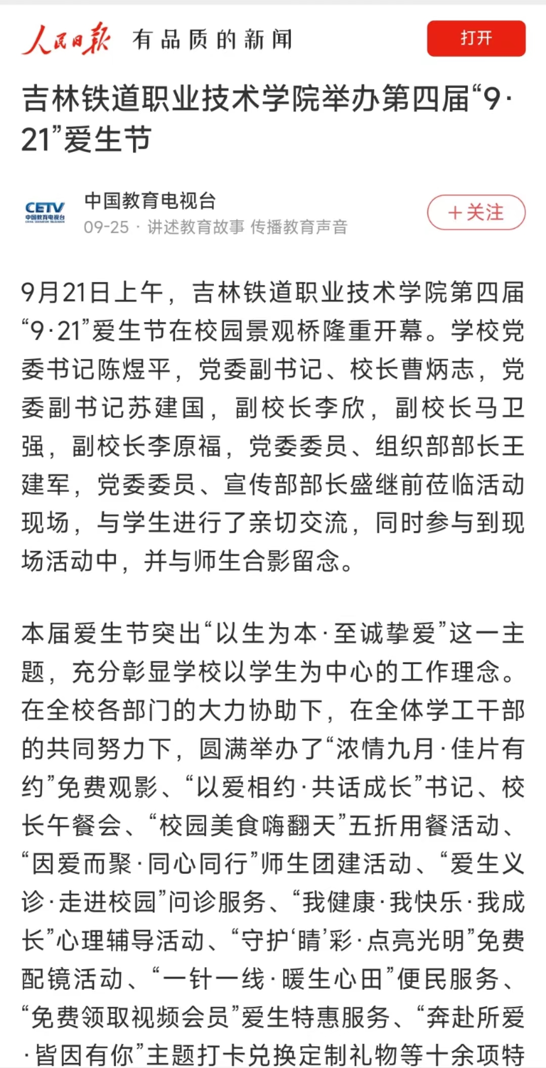 9月25日,【中国教育电视台】以“吉林铁道职业技术学院举办第四届“9·21”爱生节”为题对我校进行了报道。