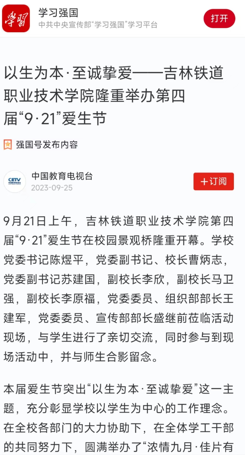 9月25日,【学习强国】以“以生为本·至诚挚爱——吉林铁道职业技术学院隆重举办第四届“9·21”爱生节”为题对我校进行了报道。