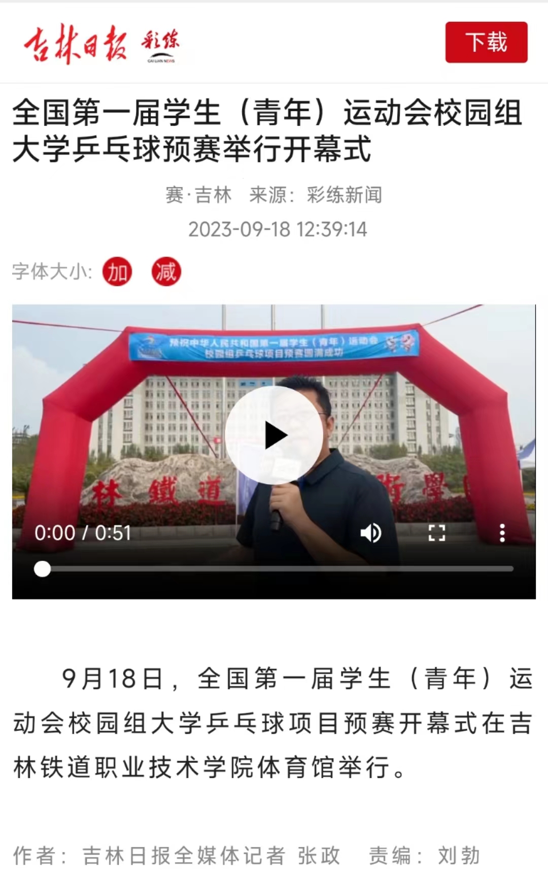 9月18日,【吉林日报】以“全国第一届学生(青年)运动会校园组大学乒乓球预赛举行开幕式”为题对我校进行了报道。