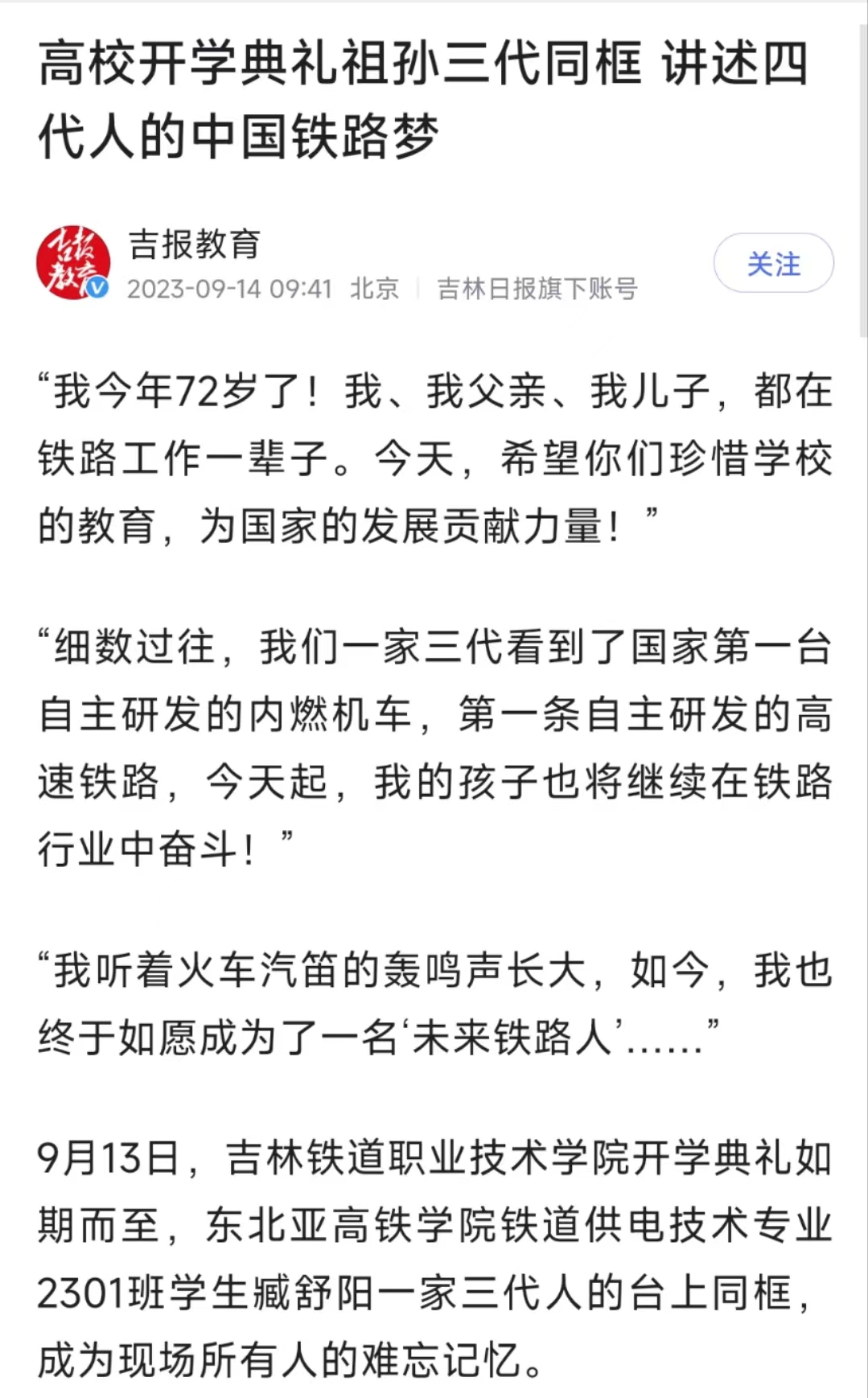 9月14日,【吉报教育】以“高校开学典礼祖孙三代同框 讲述四代人的中国铁路梦”为题对我校进行了报道。