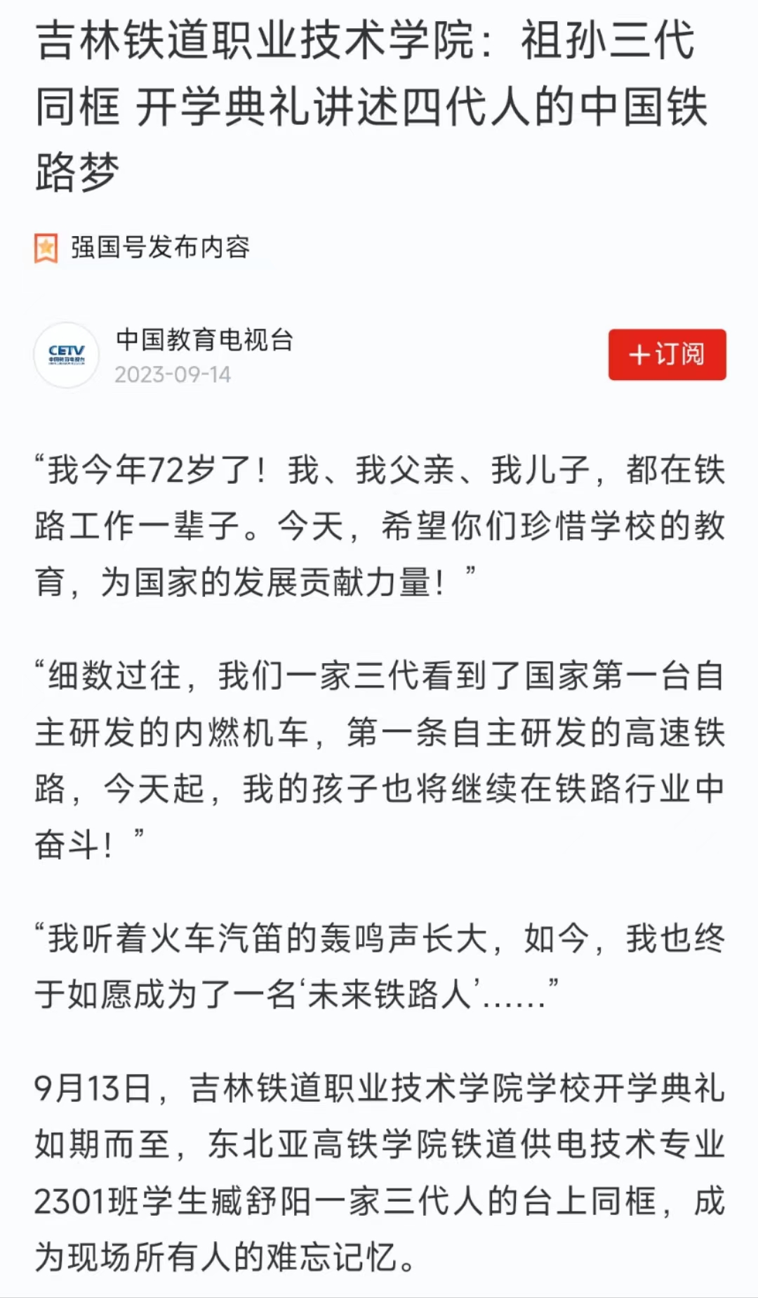 9月14日,【中国教育电视台】以“吉林铁道职业技术学院:祖孙三代同框 开学典礼讲述四代人的中国铁路梦”为题对我校进行了报道。