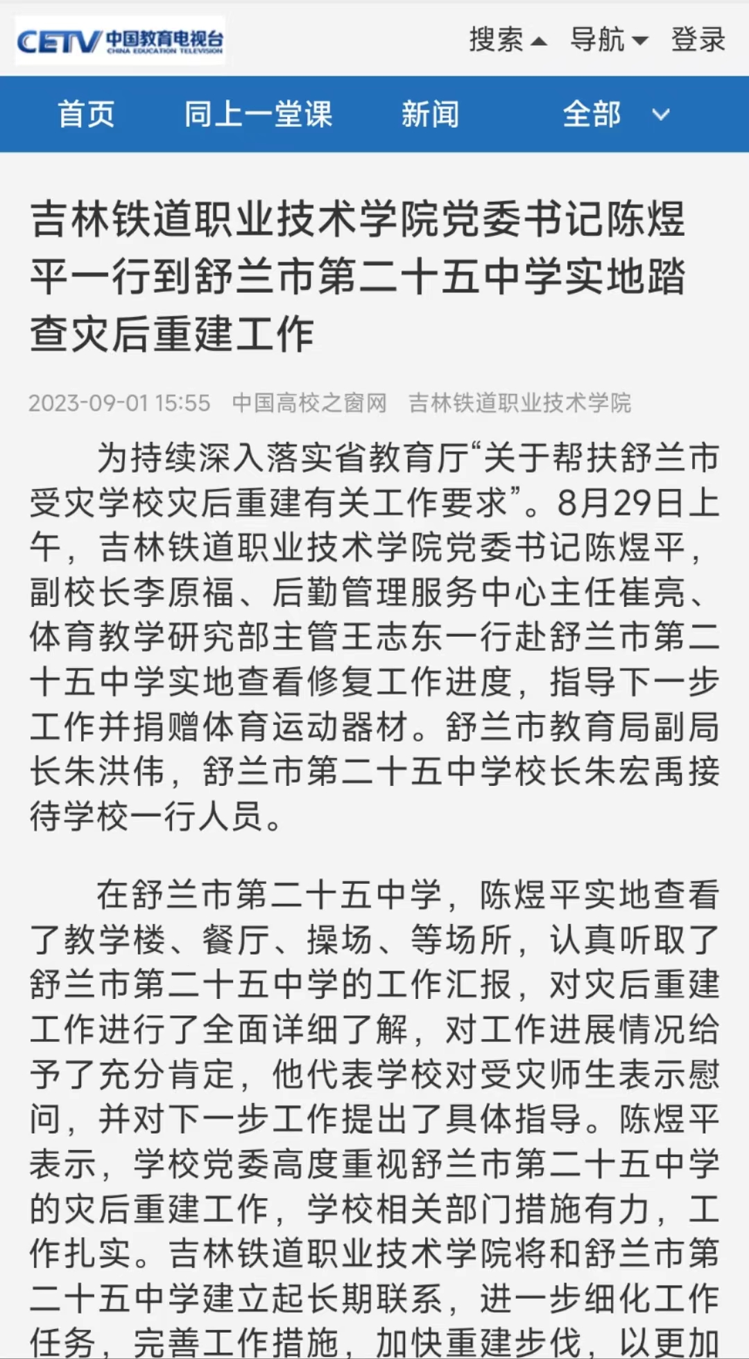 9月1日,【CETV中国教育电视台】以“吉林铁道职业技术学院党委书记陈煜平一行到舒兰市第二十五中学实地踏查灾后重建工作”为题对我校进行了报道。