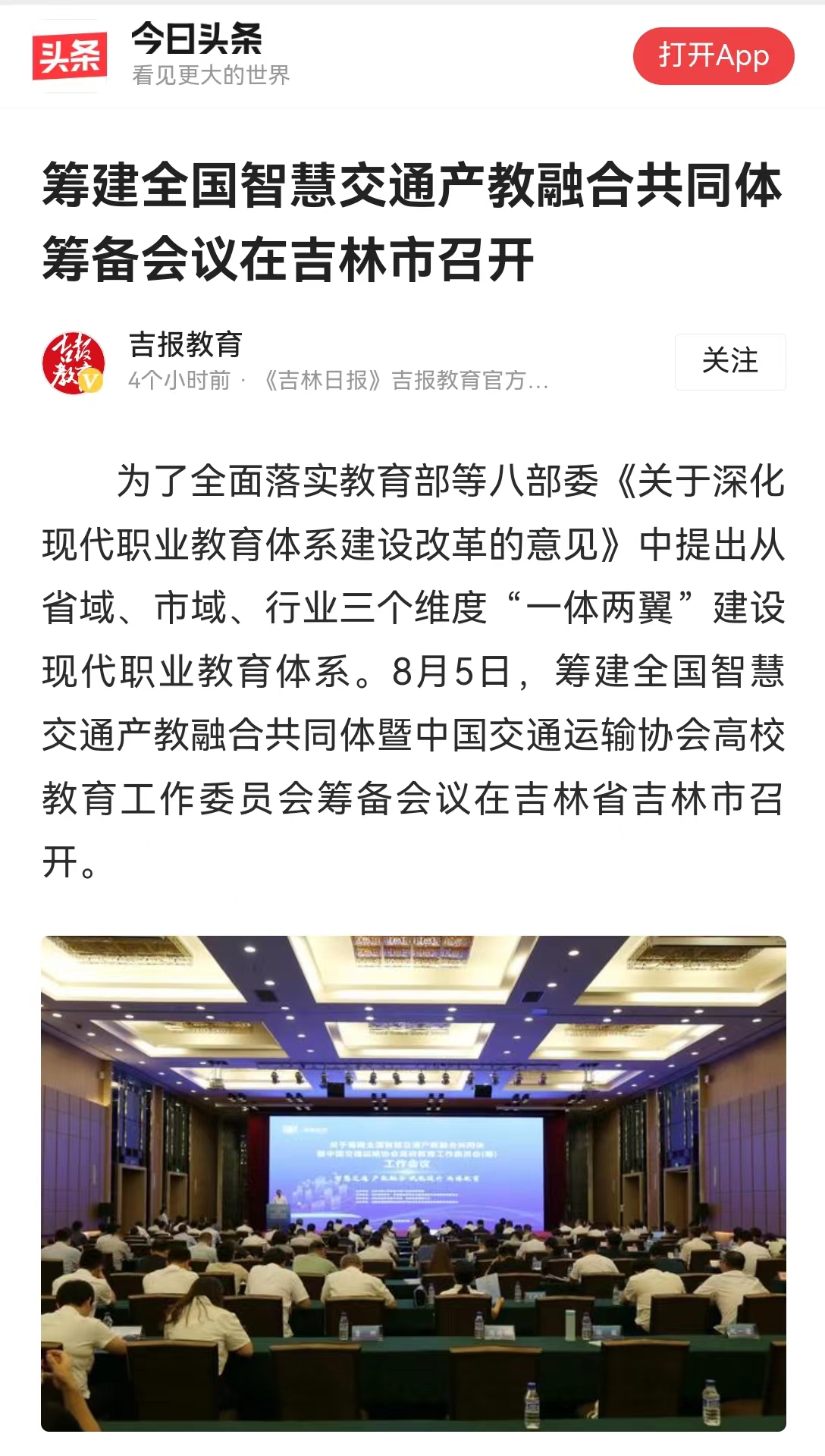 8月7日,【今日头条】“吉报教育”以“吉林铁道职业技术学院联合承办的筹建全国智慧交通产教融合共同体暨中国交通运输协会高校教育工作委员会筹备会议在吉林市召开”为题对我校进行了报道。