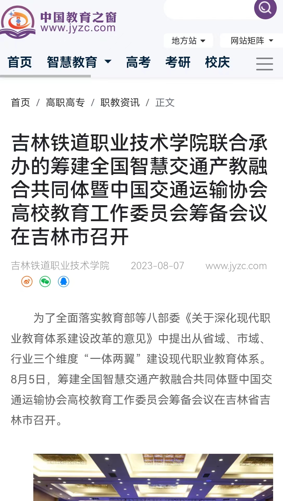 8月7日,【中国教育之窗】以“吉林铁道职业技术学院联合承办的筹建全国智慧交通产教融合共同体暨中国交通运输协会高校教育工作委员会筹备会议在吉林市召开”为题对我校进行了报道。